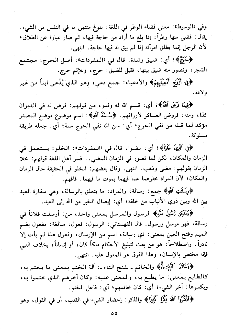 {وَخَاتَمَ النَّبِيِّينَ} والخاتم - بفتح التاء -: آلة الختم بمعنى ما يختم به، كالطابع بمعنى: ما يطبع به، والمعنى عليه: وكان آخرهم الذي ختموا به، وبكسرها: آخر الشيء؛ أي: كان خاتمهم؛ أي: فاعل الختم.