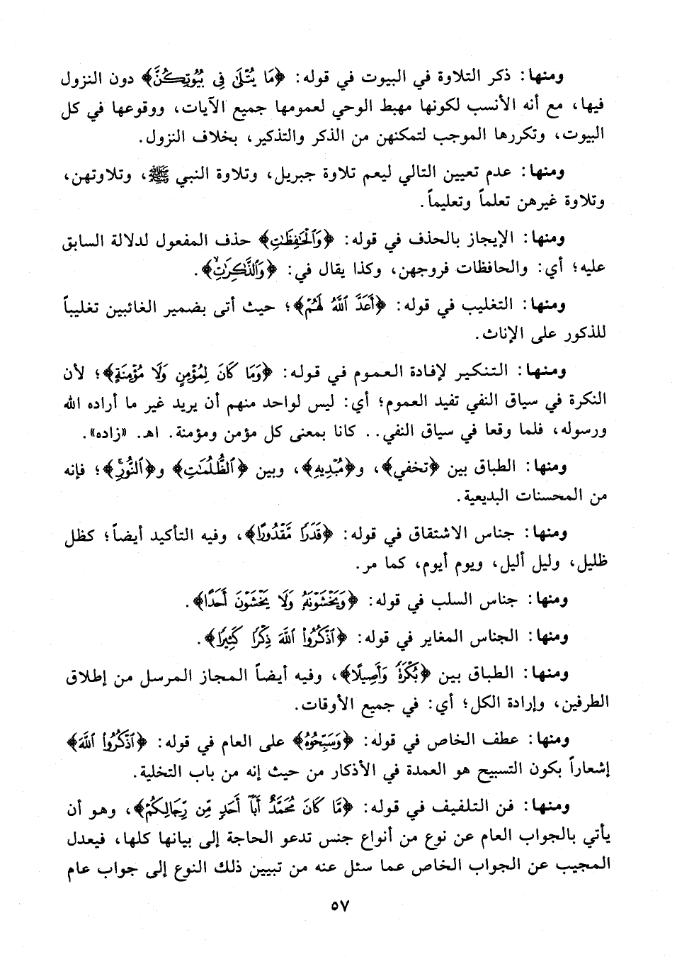 ومنها: فن التلفيف في قوله: {مَا كَانَ مُحَمَّدٌ أَبَا أَحَدٍ مِنْ رِجَالِكُمْ}، وهو أن يأتي بالجواب العام عن نوع من أنواع جنس تدعو الحاجة إلى بيانها كلها، فيعدل المجيب عن الجواب الخاص عما سئل عنه من تبيين ذلك النوع إلى جواب عام