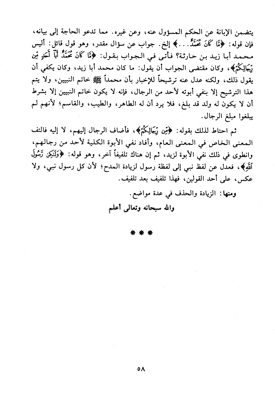 يتضمن الإبانة عن الحكم المسؤول عنه، وعن غيره مما تدعو الحاجة إلى بيانه، فإن قوله: {مَا كَانَ مُحَمَّدٌ ...} إلخ. جواب عن سؤال مقدر، وهو قول قائل: أليس محمد أبا زيد بن حارثة؟ فأتى في الجواب بقول: {مَا كَانَ مُحَمَّدٌ أَبَا أَحَدٍ مِنْ رِجَالِكُمْ}، وكان مقتضى الجواب أن يقول: ما كان محمد أبا زيد، وكان يكفي أن يقول ذلك، ولكنه عدل عنه ترشيحًا للأخبار بأن محمدًا - صلى الله عليه وسلم - خاتم النبيين، ولا يتم هذا الترشيح إلا بنفي أبوته لأحد من الرجال، فإنه لا يكون خاتم النبيين إلا بشرط أن لا يكون له ولد قد بلغ، فلا يرد أن له الطاهر، والطيب، والقاسم؛ لأنهم لم يبلغوا مبلغ الرجال.