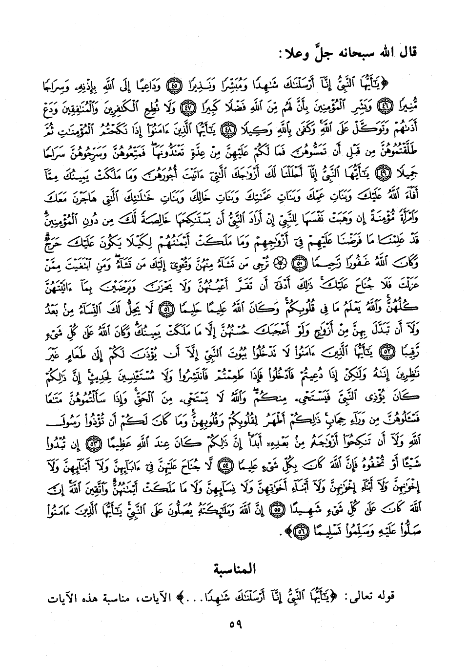 {يَا أَيُّهَا النَّبِيُّ إِنَّا أَرْسَلْنَاكَ شَاهِدًا وَمُبَشِّرًا وَنَذِيرًا (45) وَدَاعِيًا إِلَى اللَّهِ بِإِذْنِهِ وَسِرَاجًا مُنِيرًا (46) وَبَشِّرِ الْمُؤْمِنِينَ بِأَنَّ لَهُمْ مِنَ اللَّهِ فَضْلًا كَبِيرًا (47) وَلَا تُطِعِ الْكَافِرِينَ وَالْمُنَافِقِينَ وَدَعْ أَذَاهُمْ وَتَوَكَّلْ عَلَى اللَّهِ وَكَفَى بِاللَّهِ وَكِيلًا (48) يَا أَيُّهَا الَّذِينَ آمَنُوا إِذَا نَكَحْتُمُ الْمُؤْمِنَاتِ ثُمَّ طَلَّقْتُمُوهُنَّ مِنْ قَبْلِ أَنْ تَمَسُّوهُنَّ فَمَا لَكُمْ عَلَيْهِنَّ مِنْ عِدَّةٍ تَعْتَدُّونَهَا فَمَتِّعُوهُنَّ وَسَرِّحُوهُنَّ سَرَاحًا جَمِيلًا (49) يَا أَيُّهَا النَّبِيُّ إِنَّا أَحْلَلْنَا لَكَ أَزْوَاجَكَ اللَّاتِي آتَيْتَ أُجُورَهُنَّ وَمَا مَلَكَتْ يَمِينُكَ مِمَّا أَفَاءَ اللَّهُ عَلَيْكَ وَبَنَاتِ عَمِّكَ وَبَنَاتِ عَمَّاتِكَ وَبَنَاتِ خَالِكَ وَبَنَاتِ خَالَاتِكَ اللَّاتِي هَاجَرْنَ مَعَكَ وَامْرَأَةً مُؤْمِنَةً إِنْ وَهَبَتْ نَفْسَهَا لِلنَّبِيِّ إِنْ أَرَادَ النَّبِيُّ أَنْ يَسْتَنْكِحَهَا خَالِصَةً لَكَ مِنْ دُونِ الْمُؤْمِنِينَ قَدْ عَلِمْنَا مَا فَرَضْنَا عَلَيْهِمْ فِي أَزْوَاجِهِمْ وَمَا مَلَكَتْ أَيْمَانُهُمْ لِكَيْلَا يَكُونَ عَلَيْكَ حَرَجٌ وَكَانَ اللَّهُ غَفُورًا رَحِيمًا (50) تُرْجِي مَنْ تَشَاءُ مِنْهُنَّ وَتُؤْوِي إِلَيْكَ مَنْ تَشَاءُ وَمَنِ ابْتَغَيْتَ مِمَّنْ عَزَلْتَ فَلَا جُنَاحَ عَلَيْكَ ذَلِكَ أَدْنَى أَنْ تَقَرَّ أَعْيُنُهُنَّ وَلَا يَحْزَنَّ وَيَرْضَيْنَ بِمَا آتَيْتَهُنَّ كُلُّهُنَّ وَاللَّهُ يَعْلَمُ مَا فِي قُلُوبِكُمْ وَكَانَ اللَّهُ عَلِيمًا حَلِيمًا (51) لَا يَحِلُّ لَكَ النِّسَاءُ مِنْ بَعْدُ وَلَا أَنْ تَبَدَّلَ بِهِنَّ مِنْ أَزْوَاجٍ وَلَوْ أَعْجَبَكَ حُسْنُهُنَّ إِلَّا مَا مَلَكَتْ يَمِينُكَ وَكَانَ اللَّهُ عَلَى كُلِّ شَيْءٍ رَقِيبًا (52) يَا أَيُّهَا الَّذِينَ آمَنُوا لَا تَدْخُلُوا بُيُوتَ النَّبِيِّ إِلَّا أَنْ يُؤْذَنَ لَكُمْ إِلَى طَعَامٍ غَيْرَ نَاظِرِينَ إِنَاهُ وَلَكِنْ إِذَا دُعِيتُمْ فَادْخُلُوا فَإِذَا طَعِمْتُمْ فَانْتَشِرُوا وَلَا مُسْتَأْنِسِينَ لِحَدِيثٍ إِنَّ ذَلِكُمْ كَانَ يُؤْذِي النَّبِيَّ فَيَسْتَحْيِي مِنْكُمْ وَاللَّهُ لَا يَسْتَحْيِي مِنَ الْحَقِّ وَإِذَا سَأَلْتُمُوهُنَّ مَتَاعًا فَاسْأَلُوهُنَّ مِنْ وَرَاءِ حِجَابٍ ذَلِكُمْ أَطْهَرُ لِقُلُوبِكُمْ وَقُلُوبِهِنَّ وَمَا كَانَ لَكُمْ أَنْ تُؤْذُوا رَسُولَ اللَّهِ وَلَا أَنْ تَنْكِحُوا أَزْوَاجَهُ مِنْ بَعْدِهِ أَبَدًا إِنَّ ذَلِكُمْ كَانَ عِنْدَ اللَّهِ عَظِيمًا (53) إِنْ تُبْدُوا شَيْئًا أَوْ تُخْفُوهُ فَإِنَّ اللَّهَ كَانَ بِكُلِّ شَيْءٍ عَلِيمًا (54) لَا جُنَاحَ عَلَيْهِنَّ فِي آبَائِهِنَّ وَلَا أَبْنَائِهِنَّ وَلَا إِخْوَانِهِنَّ وَلَا أَبْنَاءِ إِخْوَانِهِنَّ وَلَا أَبْنَاءِ أَخَوَاتِهِنَّ وَلَا نِسَائِهِنَّ وَلَا مَا مَلَكَتْ أَيْمَانُهُنَّ وَاتَّقِينَ اللَّهَ إِنَّ اللَّهَ كَانَ عَلَى كُلِّ شَيْءٍ شَهِيدًا (55) إِنَّ اللَّهَ وَمَلَائِكَتَهُ يُصَلُّونَ عَلَى النَّبِيِّ يَا أَيُّهَا الَّذِينَ آمَنُوا صَلُّوا عَلَيْهِ وَسَلِّمُوا تَسْلِيمًا (56)}.