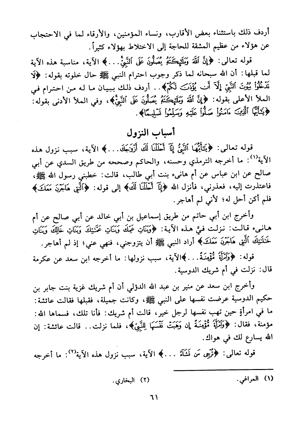 وأخرج ابن أبي حاتم من طريق إسماعيل بن أبي خالد عن أبي صالح عن أم هانىء قالت: نزلت فيَّ هذه الآية: {وَبَنَاتِ عَمِّكَ وَبَنَاتِ عَمَّاتِكَ وَبَنَاتِ خَالِكَ وَبَنَاتِ خَالَاتِكَ اللَّاتِي هَاجَرْنَ مَعَكَ} أراد النبي - صلى الله عليه وسلم - أن يتزوجني، فنهي عني؛ إذ لم أهاجر.