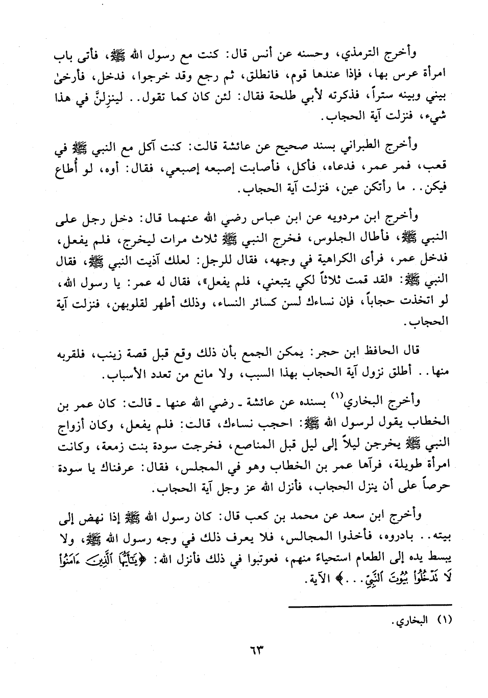 وأخرج الترمذي، وحسنه عن أنس قال: كنت مع رسول الله - صلى الله عليه وسلم -، فأتى باب امرأة عرس بها، فإذا عندها قوم، فانطلق، ثم رجع وقد خرجوا، فدخل، فأرخى بيني وبينه سترًا، فذكرته لأبي طلحة فقال: لئن كان كما تقول .. لينزِلنَّ في هذا شيء، فنزلت آية الحجاب.