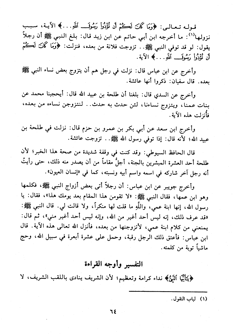 وأخرج ابن سعد عن أبي بكر بن عمرو بن حزم قال: نزلت في طلحة بن عبيد الله؛ لأنه قال: إذا توفي رسول الله - صلى الله عليه وسلم - .. تزوجت عائشة.