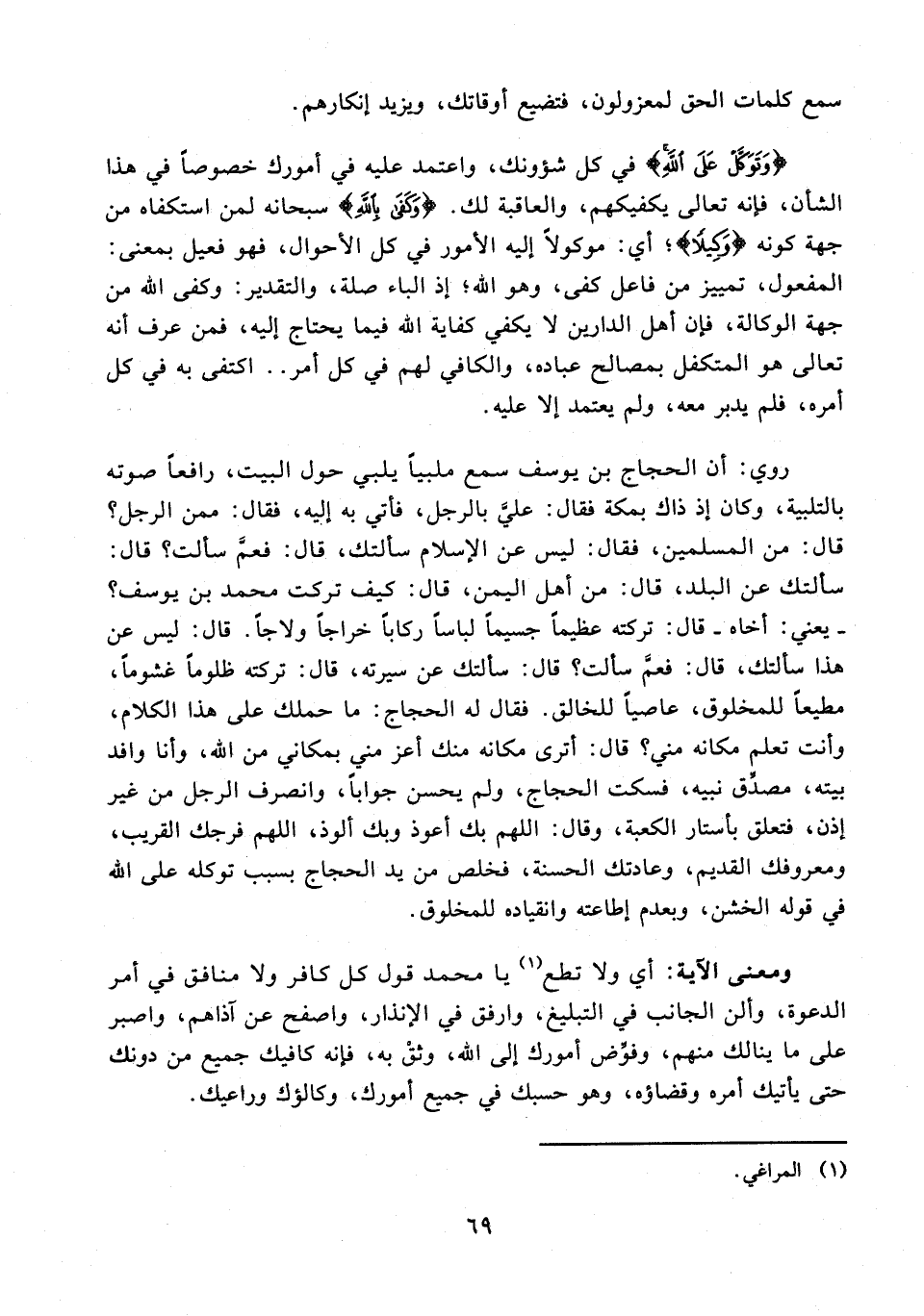 ومعنى الآية: أي ولا تطع (¬1) يا محمد قول كل كافر ولا منافق في أمر الدعوة، وألن الجانب في التبليغ، وارفق في الإنذار، واصفح عن آذاهم، واصبر على ما ينالك منهم، وفوِّض أمورك إلى الله، وثقْ به، فإنه كافيك جميع من دونك حتى يأتيك أمره وقضاؤه، وهو حسبك في جميع أمورك، وكالؤك وراعيك.