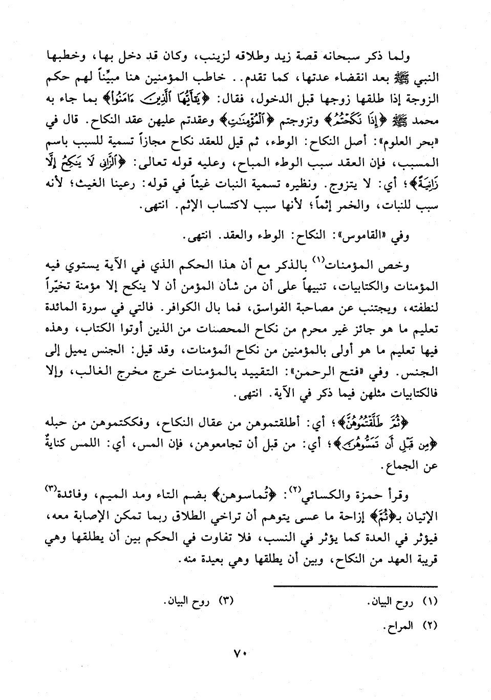 49 - ولما ذكر سبحانه قصة زيد وطلاقه لزينب، وكان قد دخل بها، وخطبها النبي - صلى الله عليه وسلم - بعد انقضاء عدتها، كما تقدم .. خاطب المؤمنين هنا مبيِّنًا لهم حكم الزوجة إذا طلقها زوجها قبل الدخول، فقال: {يَا أَيُّهَا الَّذِينَ آمَنُوا} بما جاء به محمد - صلى الله عليه وسلم - {إِذَا نَكَحْتُمُ} وتزوجتم {الْمُؤْمِنَاتِ} وعقدتم عليهن عقد النكاح. قال في "بحر العلوم": أصل النكاح: الوطء، ثم قيل للعقد نكاح مجازًا تسمية للسبب باسم المسبب، فإن العقد سبب الوطء المباح، وعليه قوله تعالى: {الزَّانِي لَا يَنْكِحُ إِلَّا زَانِيَةً}؛ أي: لا يتزوج. ونظيره تسمية النبات غيثًا في قوله: رعينا الغيث؛ لأنه سبب للنبات، والخمر إثمًا؛ لأنها سبب لاكتساب الإثم. انتهى.