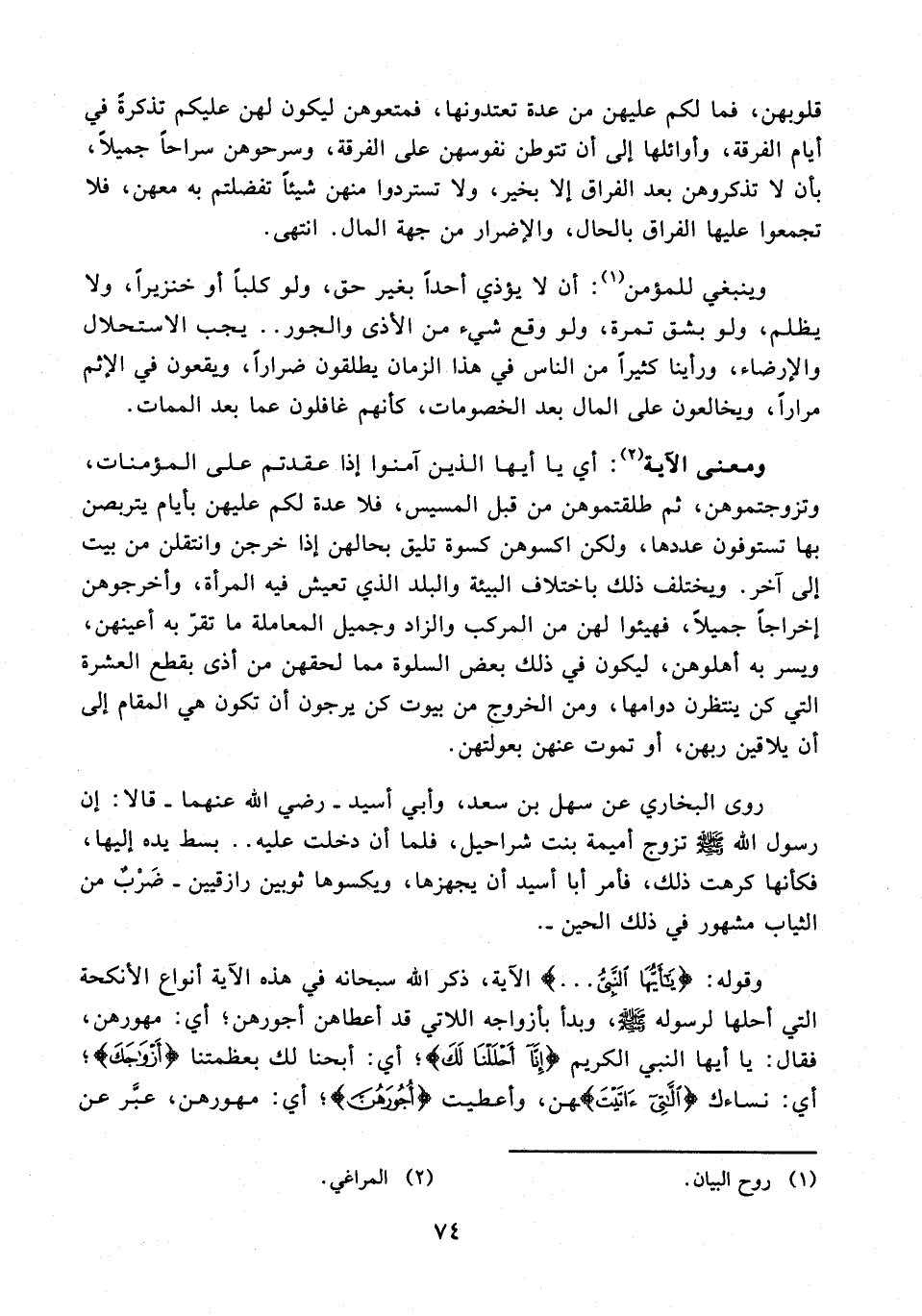 ومعنى الآية (¬2): أي يا أيها الذين آمنوا إذا عقدتم على المؤمنات، وتزوجتموهن، ثم طلقتموهن من قبل المسيس، فلا عدة لكم عليهن بأيام يتربصن بها تستوفون عددها, ولكن اكسوهن كسوة تليق بحالهن إذا خرجن وانتقلن من بيت إلى آخر. ويختلف ذلك باختلاف البيئة والبلد الذي تعيش فيه المرأة، وأخرجوهن إخراجًا جميلًا، فهيئوا لهن من المركب والزاد وجميل المعاملة ما تقرّ به أعينهن، ويسر به أهلوهن، ليكون في ذلك بعض السلوة مما لحقهن من أذى بقطع العشرة التي كن ينتظرن دوامها، ومن الخروج من بيوت كن يرجون أن تكون هي المقام إلى أن يلاقين ربهن، أو تموت عنهن بعولتهن.