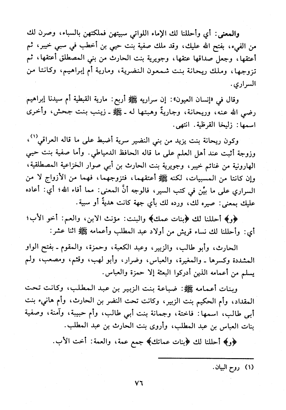 وكون ريحانة بنت يزيد من بني النضير سرية أضبط على ما قاله العراقي (¬1)، وزوجة أثبت عند أهل العلم على ما قاله الحافظ الدمياطي. وأما صفية بنت حيي الهارونية من غنائم خيبر، وجويرية بنت الحارث بن أبي صوار الخزاعية المصطلقية، وإن كانتا من المسبيات، لكنه - صلى الله عليه وسلم - أعتقهما، فتزوجهما، فهما من الأزواج لا من السراري على ما بيِّن في كتب السير، فالوجه أنَّ المعنى: مما أفاء الله؛ أي: أعاده عليك بمعنى: صيره لك، ورده لك بأي جهة كانت هديةً أو سبية.