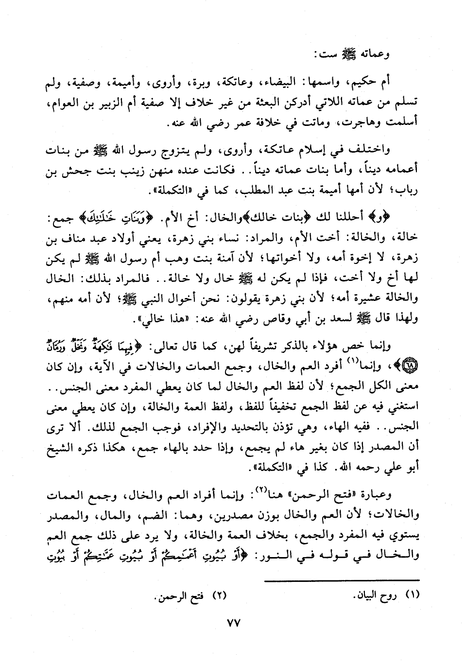 وعبارة "فتح الرحمن" هنا (¬2): وإنما أفراد العم والخال، وجمع العمات والخالات؛ لأن العم والخال بوزن مصدرين، وهما: الضم، والمال، والمصدر يستوي فيه المفرد والجمع، بخلاف العمة والخالة، ولا يرد على ذلك جمع العم والخال في قوله في النور: {أَوْ بُيُوتِ أَعْمَامِكُمْ أَوْ بُيُوتِ عَمَّاتِكُمْ أَوْ بُيُوتِ