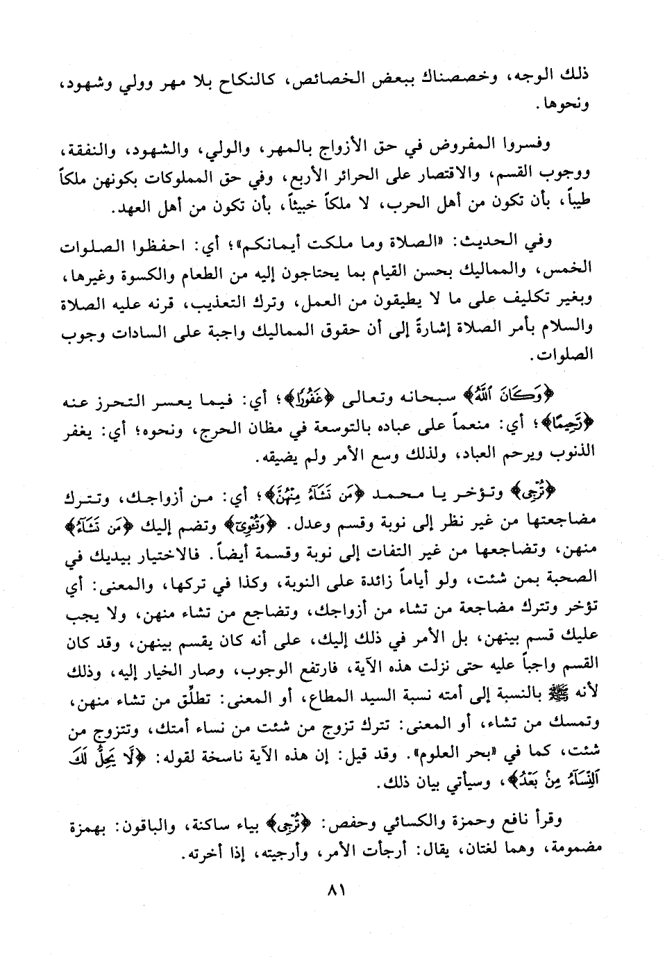 51 - {تُرْجِي} وتؤخر يا محمد {مَنْ تَشَاءُ مِنْهُنَّ}؛ أي: من أزواجك، وتترك مضاجعتها من غير نظر إلى نوبة وقسم وعدل. {وَتُؤْوِي} وتضم إليك {مَنْ تَشَاءُ} منهن، وتضاجعها من غير التفات إلى نوبة وقسمة أيضًا. فالاختيار بيديك في الصحبة بمن شئت، ولو أيامًا زائدة على النوبة، وكذا في تركها، والمعنى: أي تؤخر وتترك مضاجعة من تشاء من أزواجك، وتضاجع من تشاء منهن، ولا يجب عليك قسم بينهن، بل الأمر في ذلك إليك، على أنه كان يقسم بينهن، وقد كان القسم واجبًا عليه حتى نزلت هذه الآية، فارتفع الوجوب، وصار الخيار إليه، وذلك لأنه - صلى الله عليه وسلم - بالنسبة إلى أمته نسبة السيد المطاع، أو المعنى: تطلِّق من تشاء منهن، وتمسك من تشاء، أو المعنى: تترك تزوج من شئت من نساء أمتك، وتتزوج من شئت، كما في "بحر العلوم". وقد قيل: إن هذه الآية ناسخة لقوله: {لَا يَحِلُّ لَكَ النِّسَاءُ مِنْ بَعْدُ}، وسيأتي بيان ذلك.