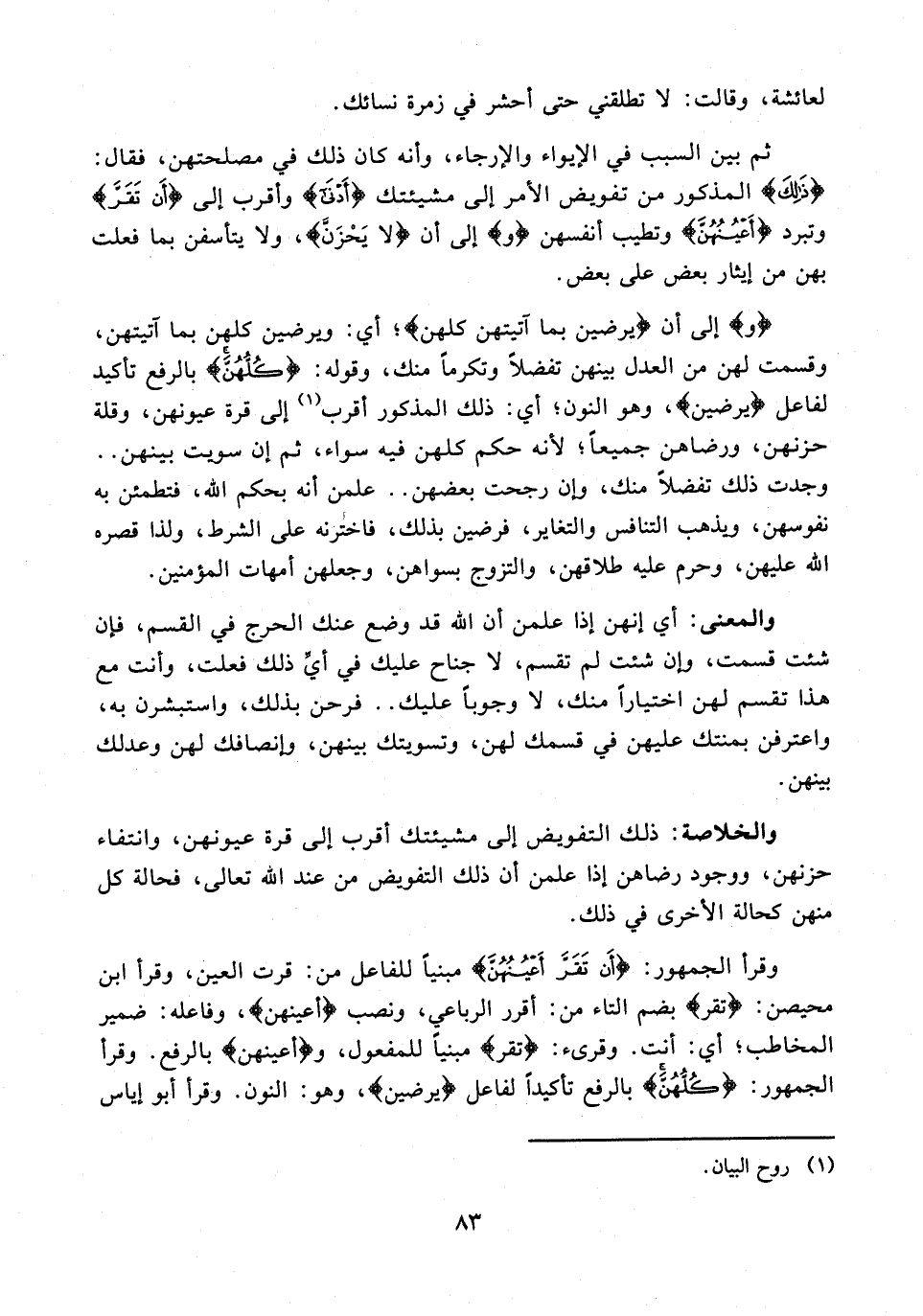 والمعنى: أي إنهن إذا علمن أن الله قد وضع عنك الحرج في القسم، فإن شئت قسمت، وإن شئت لم تقسم، لا جناح عليك في أيِّ ذلك فعلت، وأنت مع هذا تقسم لهن اختيارًا منك، لا وجوبًا عليك .. فرحن بذلك، واستبشرن به، واعترفن بمنتك عليهن في قسمك لهن، وتسويتك بينهن، وإنصافك لهن وعدلك بينهن.