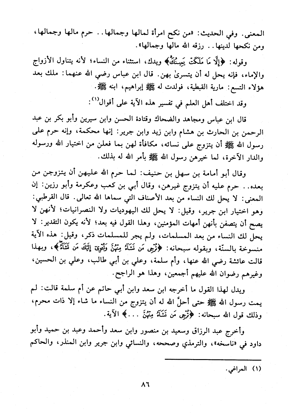 وقال أبو أمامة بن سهل بن حنيف: لما حرم الله عليهن أن يتزوجن من بعده .. حرم عليه أن يتزوج غيرهن، وقال أبي بن كعب وعكرمة وأبو رزين: إن المعنى: لا يحل لك النساء من بعد الأصناف التي سماها الله تعالى. قال القرطبي: وهو اختيار ابن جرير، وقيل: لا يحل لك اليهوديات ولا النصرانيات؛ لأنهن لا يصح أن يتصفن بأنهن أمهات المؤمنين، وهذا القول فيه بعد؛ لأنه يكون التقدير: لا يحل لك النساء من بعد المسلمات، ولم يجر للمسلمات ذكر، وقيل: هذه الآية منسوخة بالسنة، وبقوله سبحانه: {تُرْجِي مَنْ تَشَاءُ مِنْهُنَّ وَتُؤْوِي إِلَيْكَ مَنْ تَشَاءُ}، وبهذا قالت عائشة رضي الله عنها، وأم سلمة، وعلي بن أبي طالب، وعلي بن الحسين، وغيرهم رضوان الله عليهم أجمعين، وهذا هو الراجح.