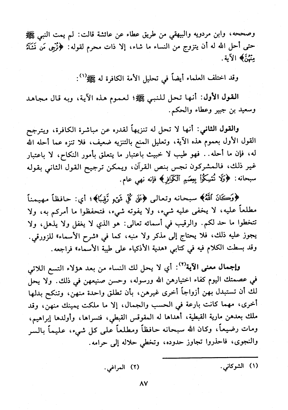 واجمال معنى الآية (¬2): أي لا يحل لك النساء من بعد هؤلاء التسع اللاتي في عصمتك اليوم كفاء اختيارهن الله ورسوله، وحسن صنيعهن في ذلك. ولا يحل لك أن تستبدل بهن أزواجًا أخرى غيرهن، بأن تطلق واحدة منهن، وتنكح بدلها أخرى، مهما كانت بارعة في الحسب والجمال، إلا ما ملكت يمينك منهن، وقد ملك بعدهن مارية القبطية، أهداها له المقوقس القبطي، فتسراها، وأولدها إبراهيم، ومات رضيعًا، وكان الله سبحانه حافظًا ومطلعًا على كل شيء، عليمًا بالسر والنجوى، فاحذروا تجاوز حدوده، وتخطي حلاله إلى حرامه.