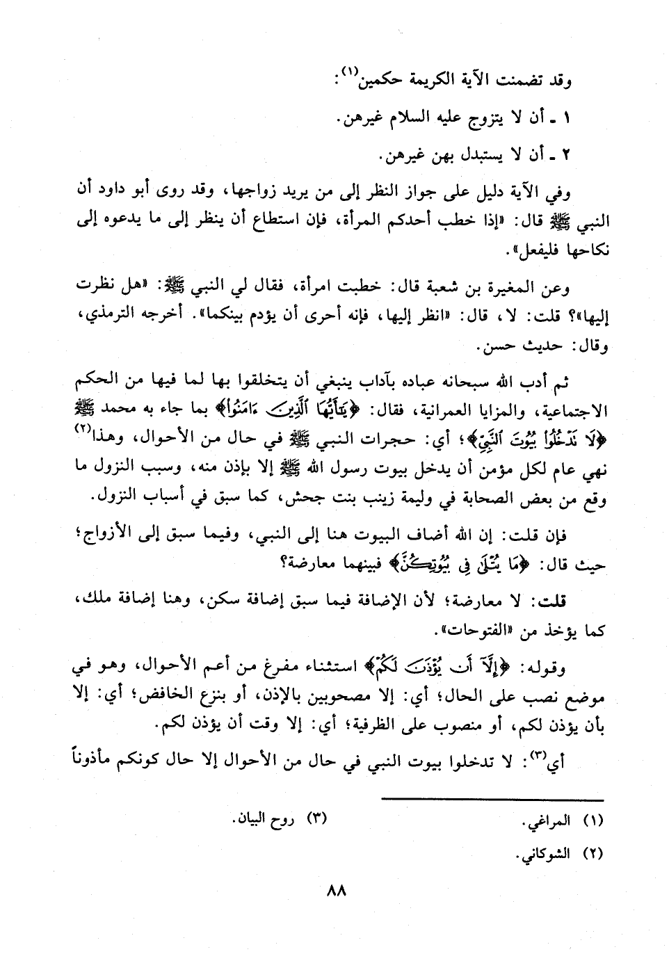 53 - ثم أدب الله سبحانه عباده بآداب ينبغي أن يتخلقوا بها لما فيها من الحكم الاجتماعية، والمزايا العمرانية، فقال: {يَا أَيُّهَا الَّذِينَ آمَنُوا} بما جاء به محمد - صلى الله عليه وسلم - {لَا تَدْخُلُوا بُيُوتَ النَّبِيِّ}؛ أي: حجرات النبي - صلى الله عليه وسلم - في حال من الأحوال، وهذا (¬2) نهي عام لكل مؤمن أن يدخل بيوت رسول الله - صلى الله عليه وسلم - إلا بإذن منه، وسبب النزول ما وقع من بعض الصحابة في وليمة زينب بنت جحش، كما سبق في أسباب النزول.