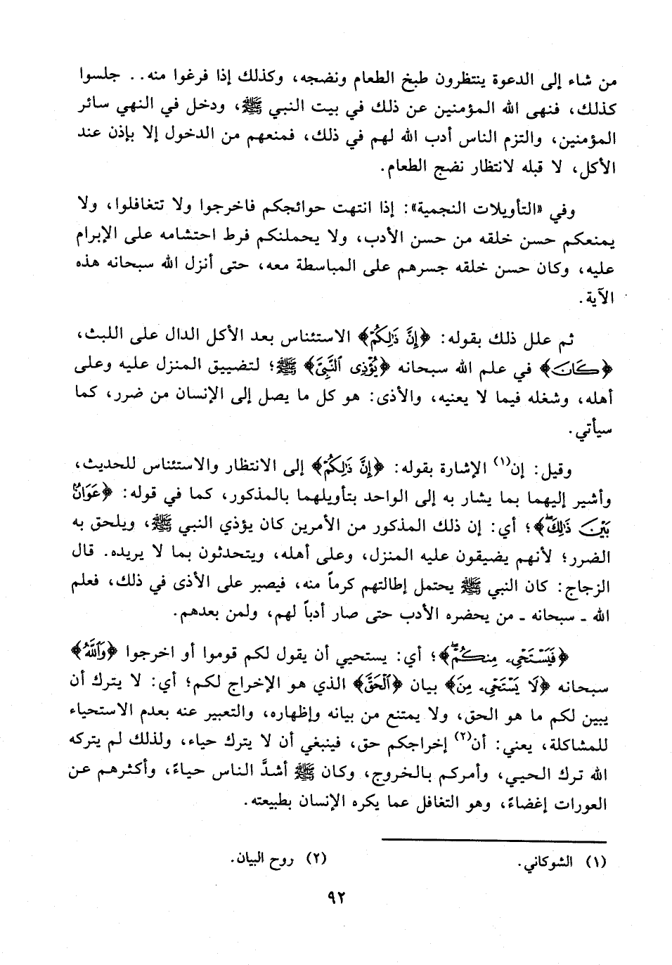 من شاء إلى الدعوة ينتظرون طبخ الطعام ونضجه، وكذلك إذا فرغوا منه .. جلسوا كذلك، فنهى الله المؤمنين عن ذلك في بيت النبي - صلى الله عليه وسلم -، ودخل في النهي سائر المؤمنين، والتزم الناس أدب الله لهم في ذلك، فمنعهم من الدخول إلا بإذن عند الأكل، لا قبله لانتظار نضج الطعام.