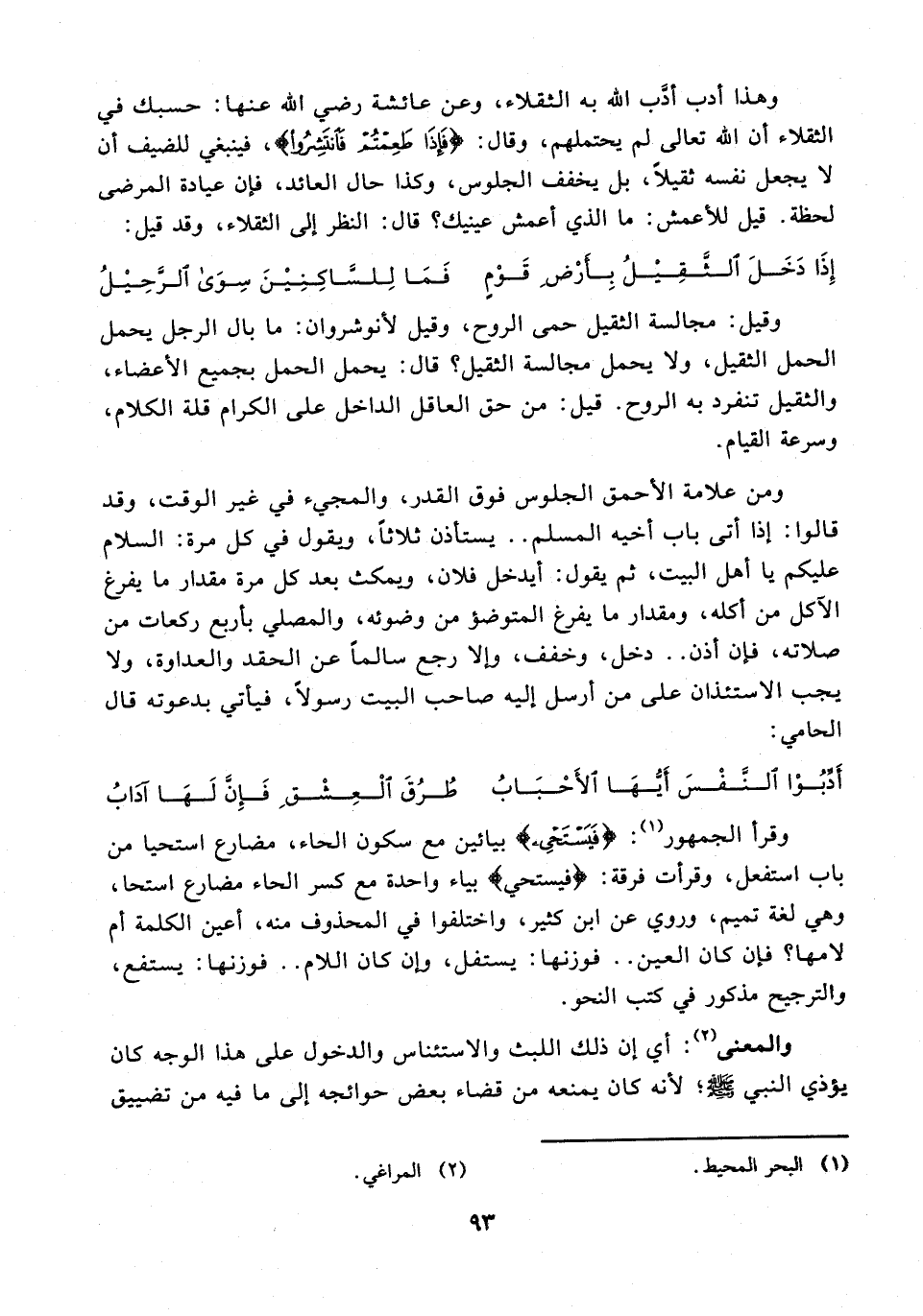 وهذا أدب أدَّب الله به الثقلاء، وعن عائشة رضي الله عنها: حسبك في الثقلاء أن الله تعالى لم يحتملهم، وقال: {فَإِذَا طَعِمْتُمْ فَانْتَشِرُوا}، فينبغي للضيف أن لا يجعل نفسه ثقيلًا، بل يخفف الجلوس، وكذا حال العائد، فإن عيادة المرضى لحظة. قيل للأعمش: ما الذي أعمش عينيك؛ قال: النظر إلى الثقلاء، وقد قيل: