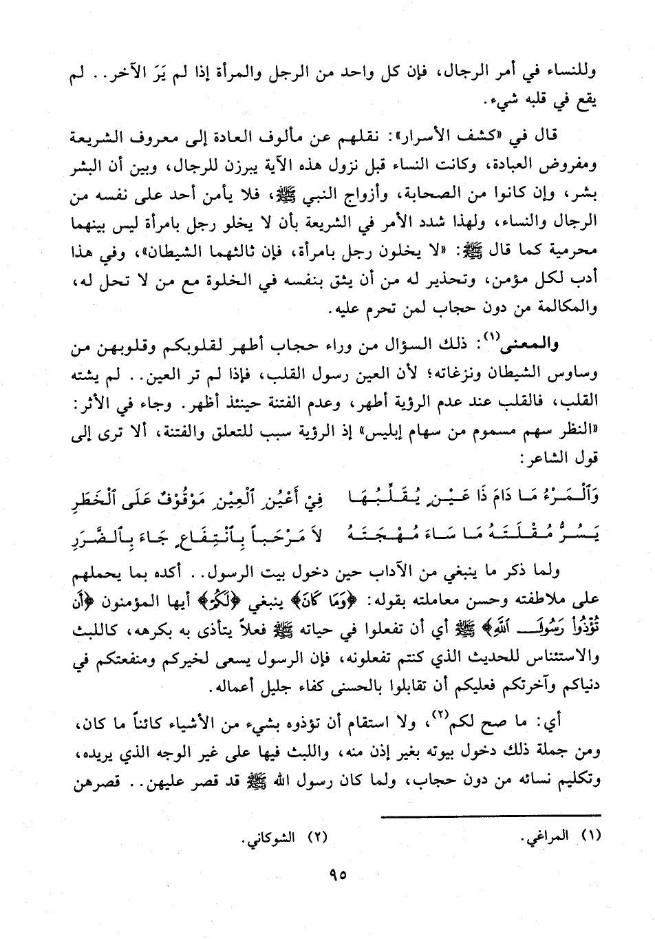 قال في "كشف الأسرار": نقلهم عن مألوف العادة إلى معروف الشريعة ومفروض العبادة, وكانت النساء قبل نزول هذه الآية يبرزن للرجال، وبين أن البشر بشر، وإن كانوا من الصحابة، وأزواج النبي - صلى الله عليه وسلم -، فلا يأمن أحد على نفسه من الرجال والنساء، ولهذا شدد الأمر في الشريعة بأن لا يخلو رجل بامرأة ليس بينهما محرمية كما قال - صلى الله عليه وسلم -: "لا يخلون رجل بامرأة، فإن ثالثهما الشيطان"، وفي هذا أدب لكل مؤمن, وتحذير له من أن يشق بنفسه في الخلوة مع من لا تحل له، والمكالمة من دون حجاب لمن تحرم عليه.