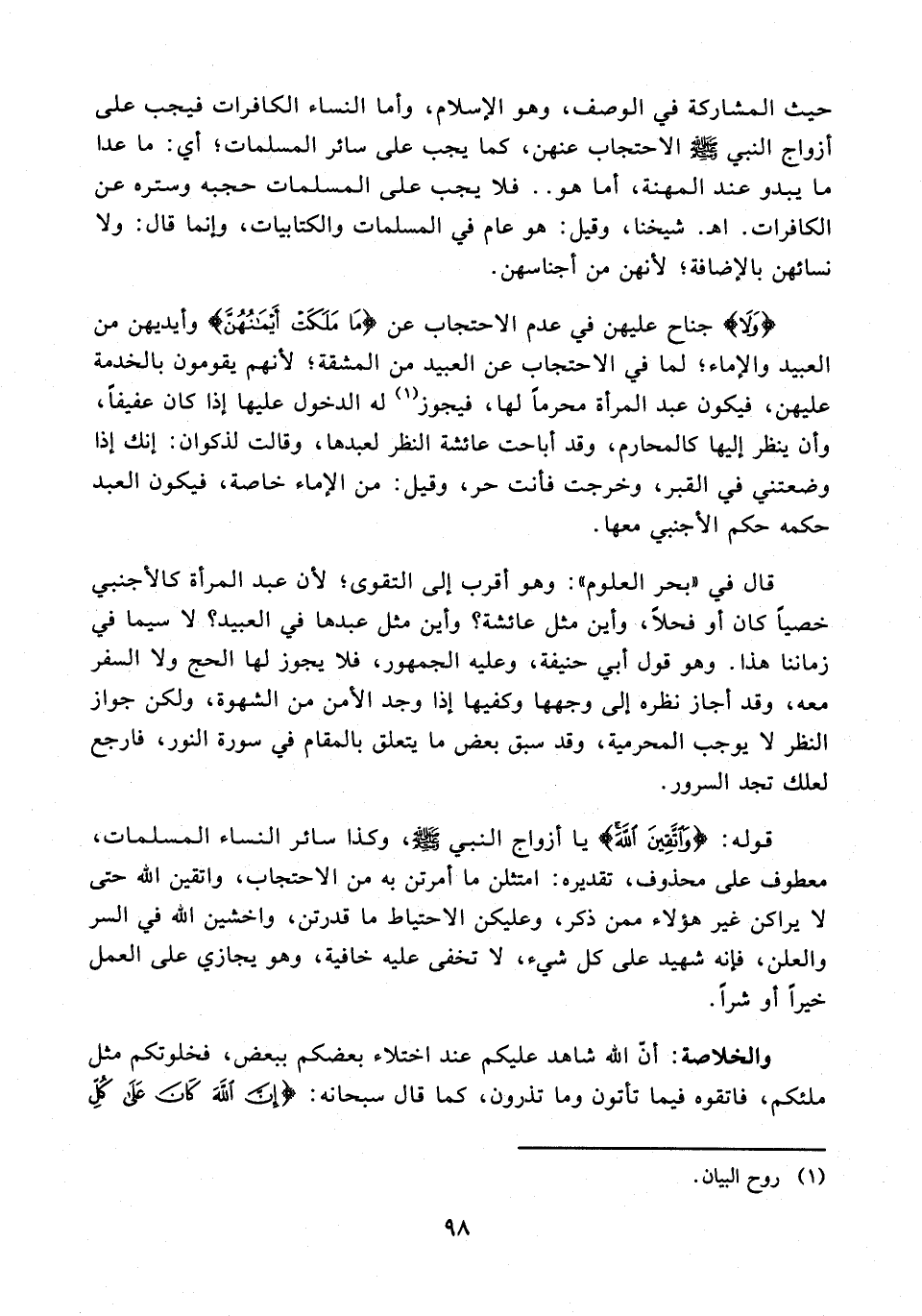 قال في "بحر العلوم": وهو أقرب إلى التقوى؛ لأن عبد المرأة كالأجنبي خصيًا كان أو فحلًا، وأين مثل عائشة؟ وأين مثل عبدها في العبيد؟ لا سيما في زماننا هذا. وهو قول أبي حنيفة، وعليه الجمهور، فلا يجوز لها الحج ولا السفر معه، وقد أجاز نظره إلى وجهها وكفيها إذا وجد الأمن من الشهوة، ولكن جواز النظر لا يوجب المحرمية، وقد سبق بعض ما يتعلق بالمقام في سورة النور، فارجع لعلك تجد السرور.