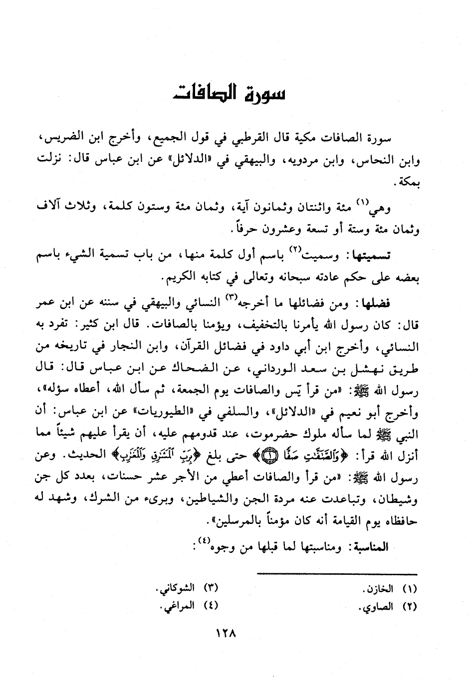 تسميتها: وسميت (¬2) باسم أول كلمة منها، من باب تسمية الشيء باسم بعضه على حكم عادته سبحانه وتعالى في كتابه الكريم. فضلها: ومن فضائلها ما أخرجه (¬3) النسائي والبيهقي في سننه عن ابن عمر قال: كان رسول الله يأمرنا بالتخفيف، ويؤمنا بالصافات. قال ابن كثير: تفرد به النسائي، وأخرج ابن أبي داود في فضائل القرآن، وابن النجار في تاريخه من طريق نهشل بن سعد الورداني، عن الضحاك عن ابن عباس قال: قال رسول الله - صلى الله عليه وسلم -: «من قرأ يس والصافات يوم الجمعة، ثم سأل الله، أعطاه سؤله»، وأخرج أبو نعيم في «الدلائل»، والسلفي في «الطيوريات» عن ابن عباس: أن النبي - صلى الله عليه وسلم - لما سأله ملوك حضرموت، عند قدومهم عليه، أن يقرأ عليهم شيئًا مما أنزل الله قرأ: {وَالصَّافَّاتِ صَفًّا (1)} حتى بلغ {بِرَبِّ الْمَشارِقِ وَالْمَغارِبِ} الحديث. وعن رسول الله - صلى الله عليه وسلم -: «من قرأ والصافات أعطي من الأجر عشر حسنات، بعدد كل جن وشيطان، وتباعدت عنه مردة الجن والشياطين، وبرىء من الشرك، وشهد له حافظاه يوم القيامة أنه كان مؤمنًا بالمرسلين».