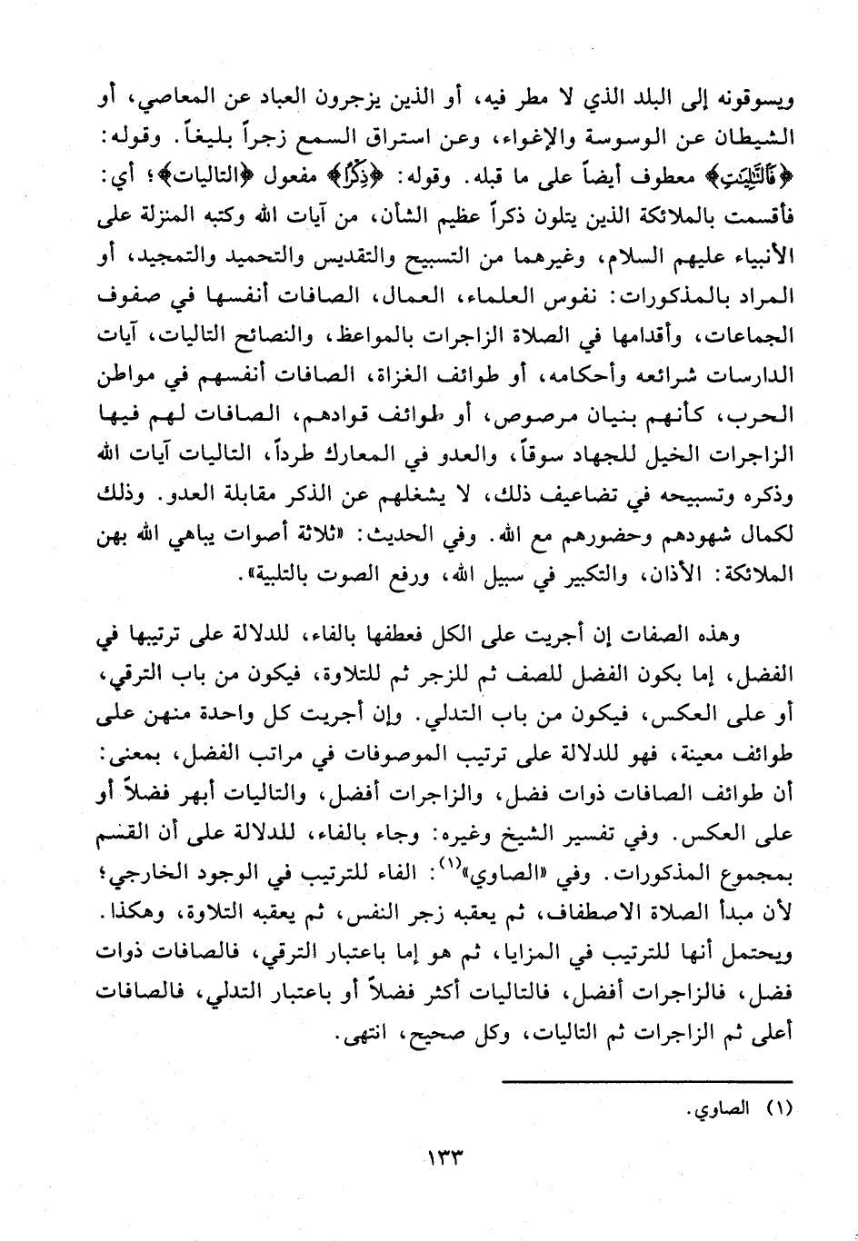 3 - وقوله: فَالتَّالِياتِ معطوف أيضًا على ما قبله. وقوله: {ذِكْرًا} مفعول {التاليات}؛ أي: فأقسمت بالملائكة الذين يتلون ذكرًا عظيم الشأن، من آيات الله وكتبه المنزلة على الأنبياء عليهم السلام، وغيرهما من التسبيح والتقديس والتحميد والتمجيد، أو المراد بالمذكورات: نفوس العلماء، العمال، الصافات أنفسها في صفوف الجماعات، وأقدامها في الصلاة الزاجرات بالمواعظ، والنصائح التاليات، آيات الدارسات شرائعه وأحكامه، أو طوائف الغزاة، الصافات أنفسهم في مواطن الحرب، كأنهم بنيان مرصوص، أو طوائف قوادهم، الصافات لهم فيها الزاجرات الخيل للجهاد سوقًا، والعدو في المعارك طردًا، التاليات آيات الله وذكره وتسبيحه في تضاعيف ذلك، لا يشغلهم عن الذكر مقابلة العدو. وذلك لكمال شهودهم وحضورهم مع الله. وفي الحديث: «ثلاثة أصوات يباهي الله بهن الملائكة: الأذان، والتكبير في سبيل الله، ورفع الصوت بالتلبية».