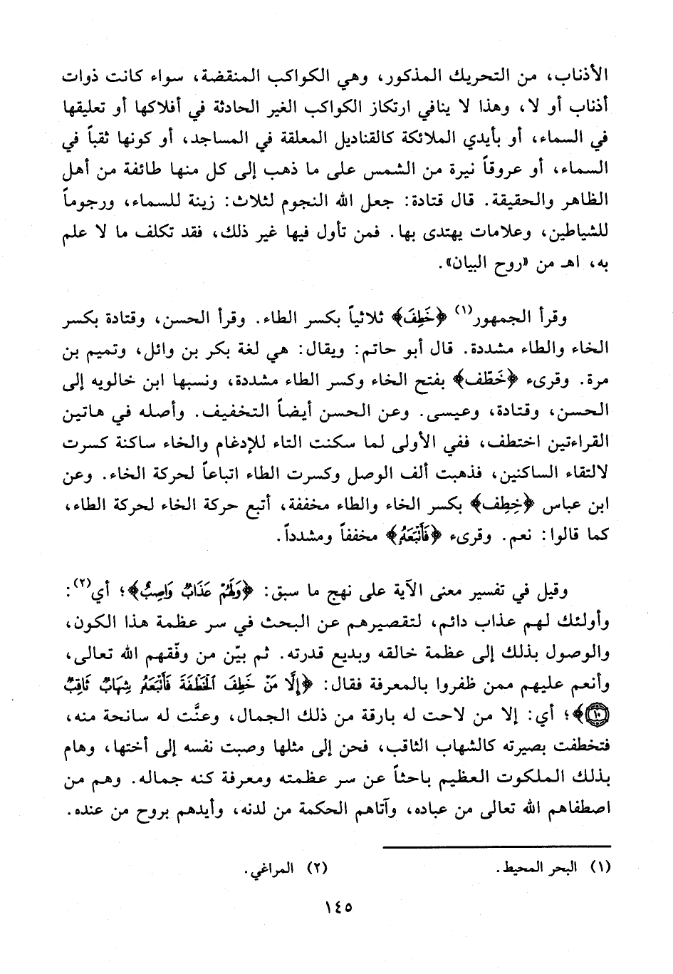 وقرأ الجمهور (¬1) {خَطِفَ} ثلاثيًا بكسر الطاء. وقرأ الحسن، وقتادة بكسر الخاء والطاء مشددة. قال أبو حاتم: ويقال: هي لغة بكر بن وائل، وتميم بن مرة. وقرىء {خَطّف} بفتح الخاء وكسر الطاء مشددة، ونسبها ابن خالويه إلى الحسن، وقتادة، وعيسى. وعن الحسن أيضًا التخفيف. وأصله في هاتين القراءتين اختطف، ففي الأولى لما سكنت التاء للإدغام والخاء ساكنة كسرت لالتقاء الساكنين، فذهبت ألف الوصل وكسرت الطاء اتباعا لحركة الخاء. وعن ابن عباس {خِطِف} بكسر الخاء والطاء مخففة، أتبع حركة الخاء لحركة الطاء، كما قالوا: نعم. وقرىء {فأتبعه} مخففًا ومشددًا.