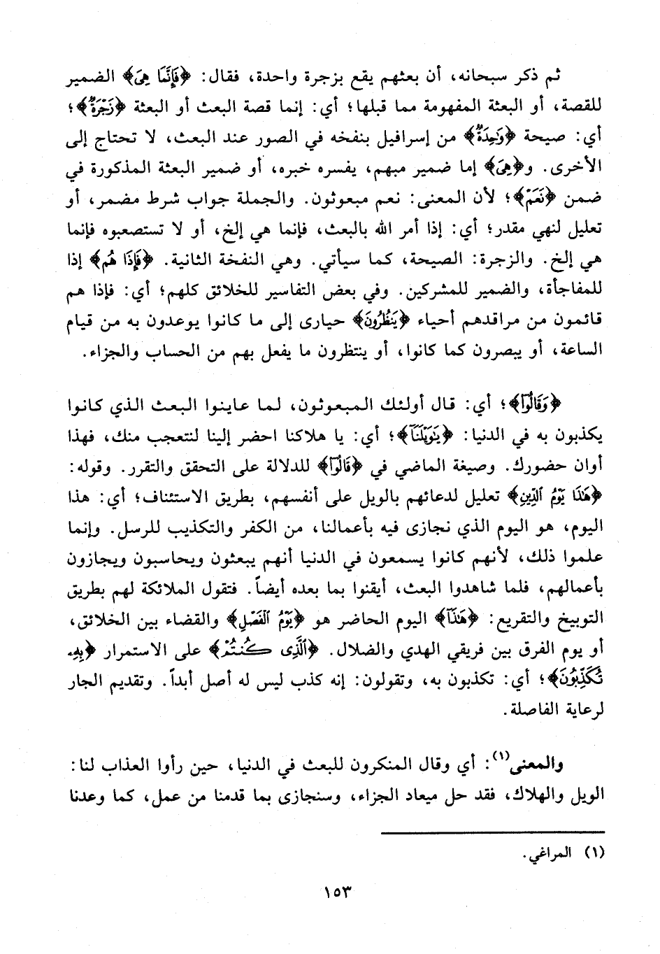 19 - ثم ذكر سبحانه، أن بعثهم يقع بزجرة واحدة، فقال: {فَإِنَّما هِيَ} الضمير للقصة، أو البعثة المفهومة مما قبلها؛ أي: إنما قصة البعث أو البعثة {زَجْرَةٌ}؛ أي: صيحة {واحِدَةٌ} من إسرافيل بنفخه في الصور عند البعث، لا تحتاج إلى الأخرى. و {هِيَ} إما ضمير مبهم، يفسره خبره، أو ضمير البعثة المذكورة في ضمن {نَعَمْ}؛ لأن المعنى: نعم مبعوثون. والجملة جواب شرط مضمر، أو تعليل لنهي مقدر؛ أي: إذا أمر الله بالبعث، فإنما هي إلخ، أو لا تستصعبوه فإنما هي إلخ. والزجرة: الصيحة، كما سيأتي. وهي النفخة الثانية. {فَإِذا هُمْ} إذا للمفاجأة، والضمير للمشركين. وفي بعض التفاسير للخلائق كلهم؛ أي: فإذا هم قائمون من مراقدهم أحياء {يَنْظُرُونَ} حيارى إلى ما كانوا يوعدون به من قيام الساعة، أو يبصرون كما كانوا، أو ينتظرون ما يفعل بهم من الحساب والجزاء.
