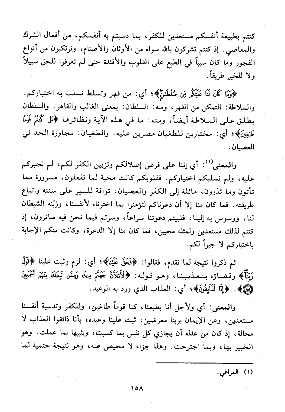 والمعنى (¬1): أي إننا على فرض إضلالكم وتزيين الكفر لكم، لم نجبركم عليه، ولم نسلبكم اختياركم. فقلوبكم كانت محبة لما تفعلون، مسرورة مما تأتون وما تذرون، مائلة إلى الكفر والعصيان، تواقة للسير على سننه واتباع طريقته. فما كان منا إلا أن دعوناكم لتؤمنوا بما اخترناه لأنفسنا، وزيّنه الشيطان لنا، ووسوس به إلينا، فلبيتم دعوتنا سراعا، وسرتم فيما نحن فيه سائرون، إذ كنتم لذلك مستعدين ولمثله محبين، فما كان منا إلا الدعوة، وكانت منكم الإجابة باختياركم لا جبرًا لكم.