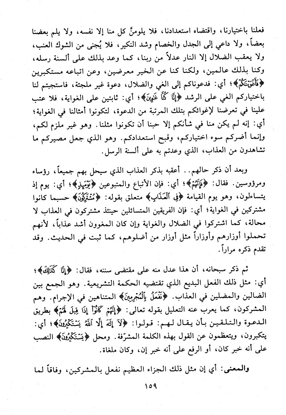 33 - وبعد أن ذكر حالهم .. أعقبه بذكر العذاب الذي سيحل بهم جميعًا، رؤساء ومرؤوسين. فقال: {فَإِنَّهُمْ}؛ أي: فإن الأتباع والمتبوعين {يَوْمَئِذٍ}؛ أي: يوم إذ يتساءلون، وهو يوم القيامة {فِي الْعَذابِ} متعلق بقوله: {مُشْتَرِكُونَ} حسبما كانوا مشتركين في الغواية؛ أي: فإن الفريقين المتسائلين حينئذ مشتركون في العذاب لا محالة، كما اشتركوا في الضلال والغواية وإن كان المغوون أشد عذابًا، لأنهم تحملوا أوزارهم وأوزارًا مثل أوزار من أضلوهم، كما ثبت في الحديث. وقد تقدم ذكره مرارًا.