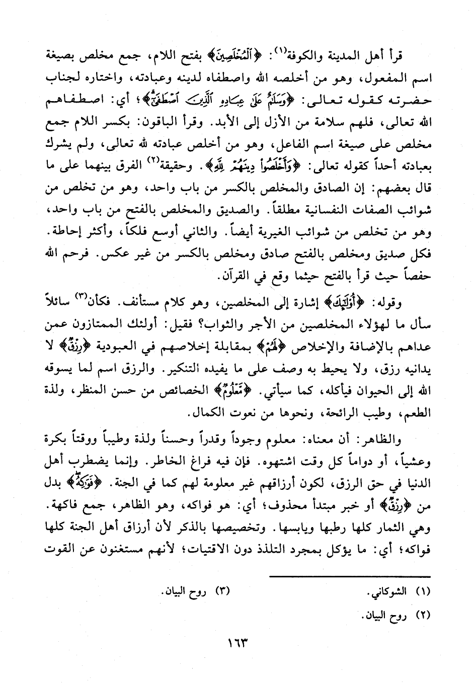 قرأ أهل المدينة والكوفة (¬1): {الْمُخْلَصِينَ} بفتح اللام، جمع مخلص بصيغة اسم المفعول، وهو من أخلصه الله واصطفاه لدينه وعبادته، واختاره لجناب حضرته كقوله تعالى: {وَسَلامٌ عَلى عِبادِهِ الَّذِينَ اصْطَفى}؛ أي: اصطفاهم الله تعالى، فلهم سلامة من الأزل إلى الأبد. وقرأ الباقون: بكسر اللام جمع مخلص على صيغة اسم الفاعل، وهو من أخلص عبادته لله تعالى، ولم يشرك بعبادته أحدًا كقوله تعالى: {وَأَخْلَصُوا دِينَهُمْ لِلَّهِ}. وحقيقة (¬2) الفرق بينهما على ما قال بعضهم: إن الصادق والمخلص بالكسر من باب واحد، وهو من تخلص من شوائب الصفات النفسانية مطلقًا. والصديق والمخلص بالفتح من باب واحد، وهو من تخلص من شوائب الغيرية أيضًا. والثاني أوسع فلكًا، وأكثر إحاطة. فكل صديق ومخلص بالفتح صادق ومخلص بالكسر من غير عكس. فرحم الله حفصا حيث قرأ بالفتح حيثما وقع في القرآن.