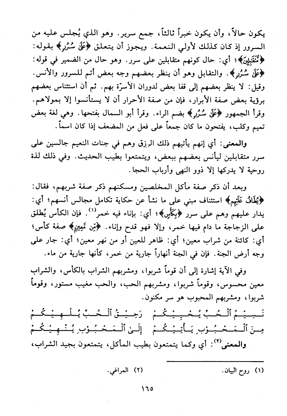 والمعنى: أي إنهم يأتيهم ذلك الرزق وهم في جنات النعيم جالسين على سرر متقابلين ليأنس بعضهم ببعض، ويتمتعوا بطيب الحديث. وفي ذلك لذة روحية لا يدركها إلا ذوو النهى وأرباب الحجا.