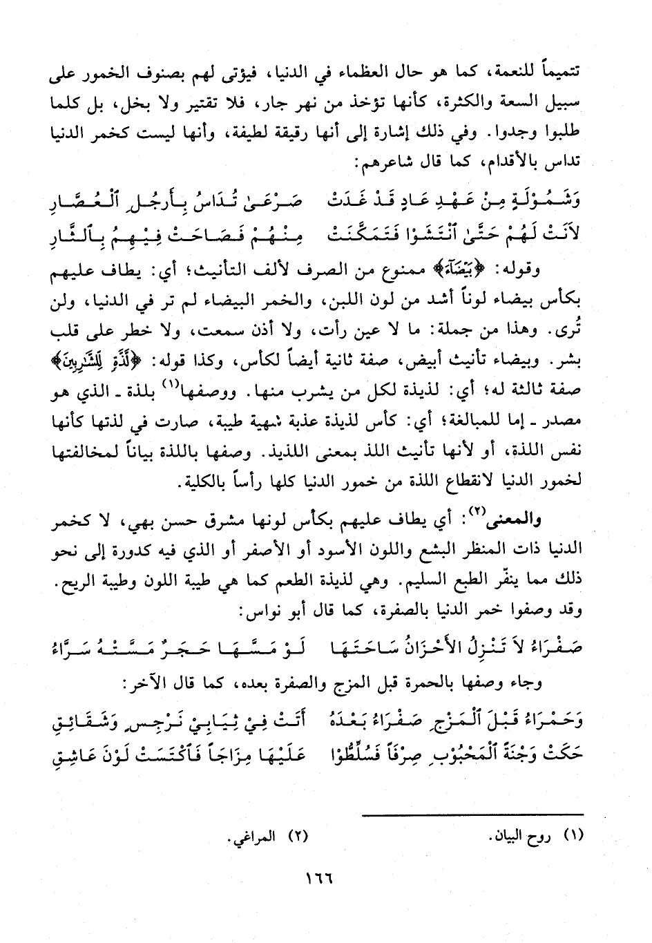 46 - وقوله: {بَيْضاءَ} ممنوع من الصرف لألف التأنيث؛ أي: يطاف عليهم بكأس بيضاء لونًا أشد من لون اللبن، والخمر البيضاء لم تر في الدنيا، ولن ترى. وهذا من جملة: ما لا عين رأت، ولا أذن سمعت، ولا خطر على قلب بشر. وبيضاء تأنيث أبيض، صفة ثانية أيضًا لكأس، وكذا قوله: {لَذَّةٍ لِلشَّارِبِينَ} صفة ثالثة له؛ أي: لذيذة لكل من يشرب منها. ووصفها (¬1) بلذة - الذي هو مصدر - إما للمبالغة؛ أي: كأس لذيذة عذبة شهية طيبة، صارت في لذتها كأنها نفس اللذة، أو لأنها تأنيث اللذ بمعنى اللذيذ. وصفها باللذة بيانًا لمخالفتها لخمور الدنيا لانقطاع اللذة من خمور الدنيا كلها رأسًا بالكلية.