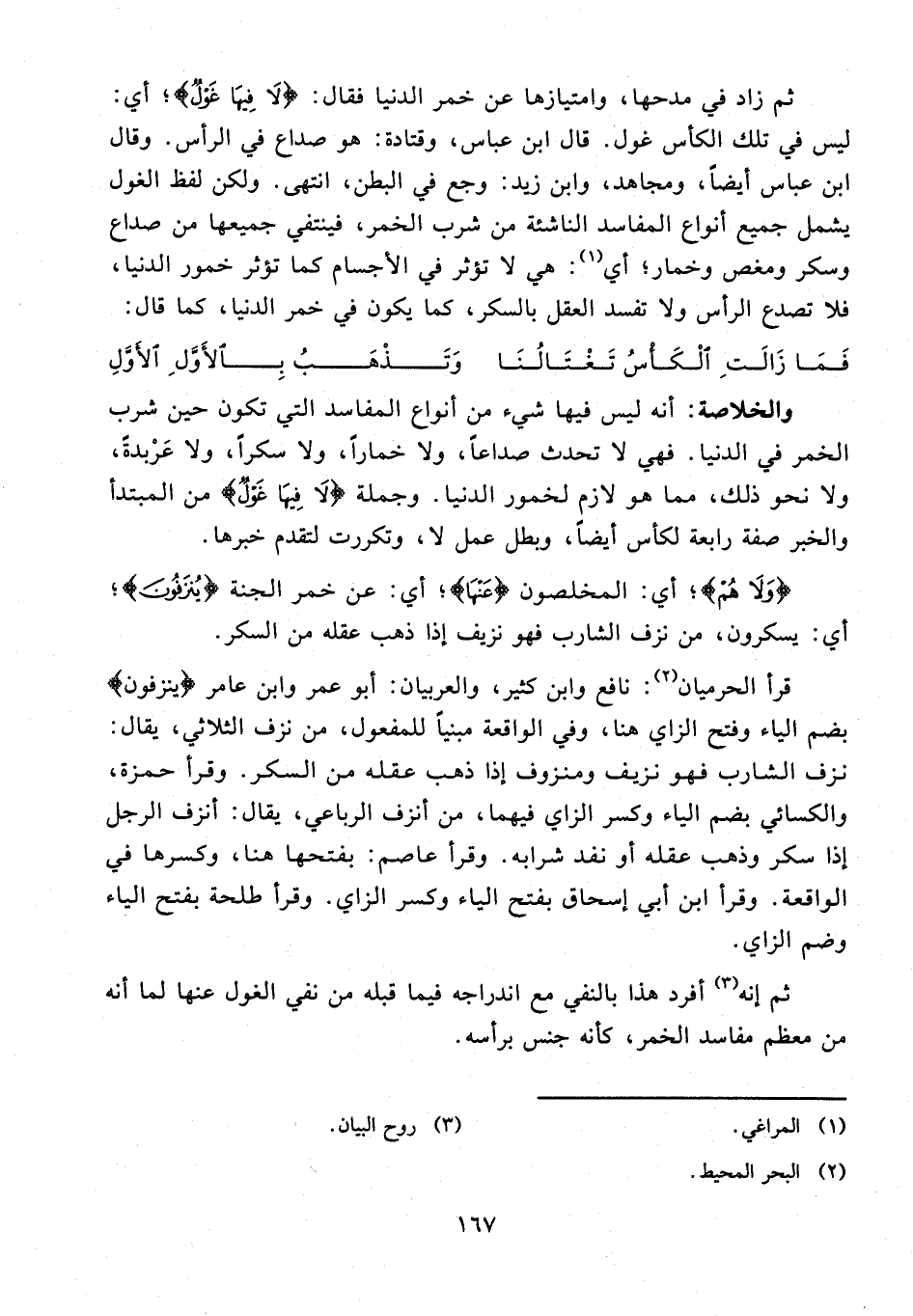 قرأ الحرميان (¬2): نافع وابن كثير، والعربيان: أبو عمر وابن عامر {ينزفون} بضم الياء وفتح الزاي هنا، وفي الواقعة مبنيًا للمفعول، من نزف الثلاثي، يقال: نزف الشارب فهو نزيف ومنزوف إذا ذهب عقله من السكر. وقرأ حمزة، والكسائي بضم الياء وكسر الزاي فيهما، من أنزف الرباعي، يقال: أنزف الرجل إذا سكر وذهب عقله أو نفد شرابه. وقرأ عاصم: بفتحها هنا، وكسرها في الواقعة. وقرأ ابن أبي إسحاق بفتح الياء وكسر الزاي. وقرأ طلحة بفتح الياء وضم الزاي.