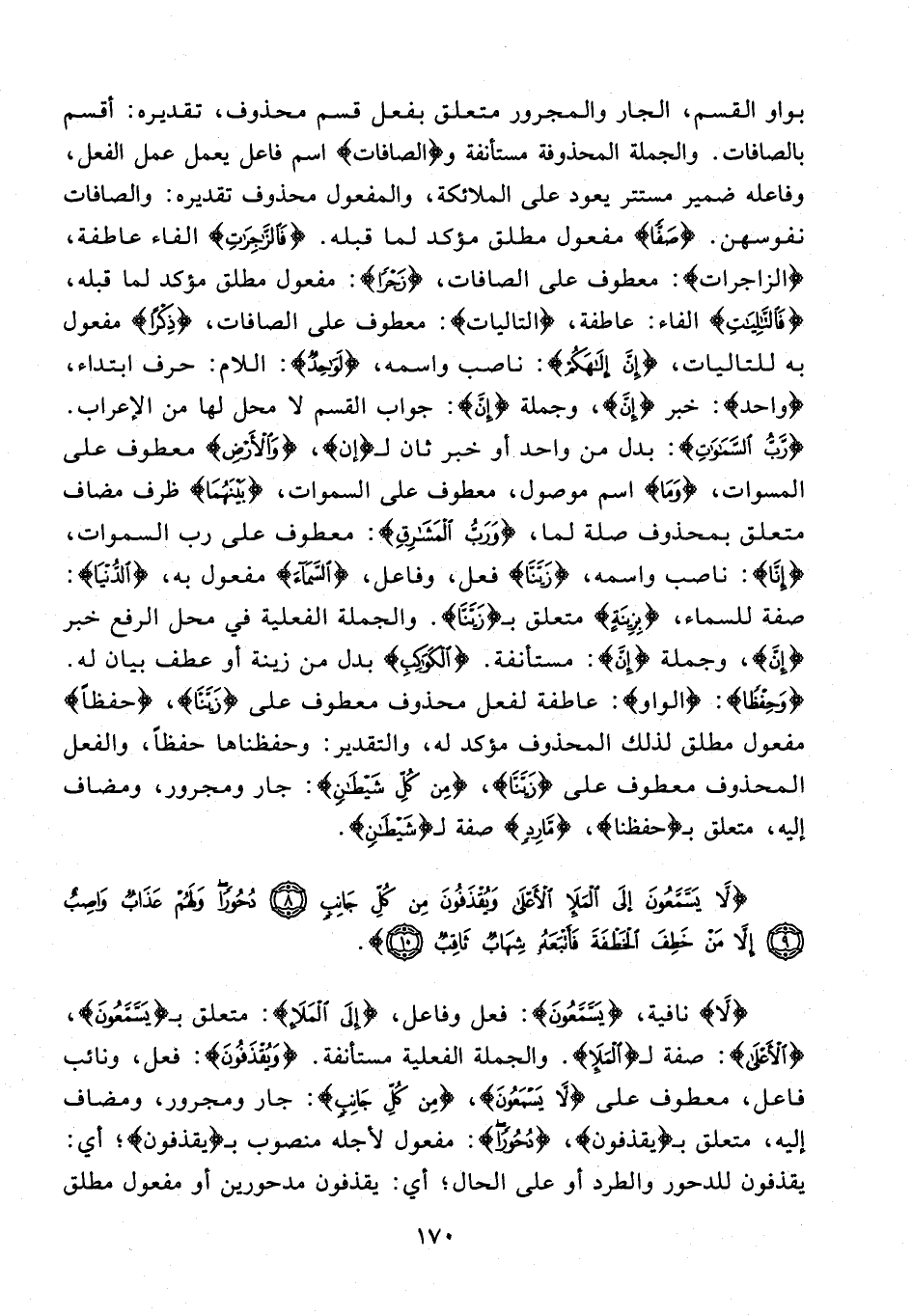 بواو القسم، الجار والمجرور متعلق بفعل قسم محذوف، تقديره: أقسم بالصافات. والجملة المحذوفة مستأنفة و {الصَّافَّاتِ} اسم فاعل يعمل عمل الفعل، وفاعله ضمير مستتر يعود على الملائكة، والمفعول محذوف تقديره: والصافات نفوسهن. {صَفًّا} مفعول مطلق مؤكد لما قبله. {فَالزَّاجِراتِ} الفاء عاطفة، {الزاجرات}: معطوف على الصافات، {زَجْرًا}: مفعول مطلق مؤكد لما قبله، {فَالتَّالِياتِ} الفاء: عاطفة، {التاليات}: معطوف على الصافات، {ذِكْرًا} مفعول به للتاليات، {إِنَّ إِلهَكُمْ}: ناصب واسمه، {لَواحِدٌ}: اللام: حرف ابتداء، {واحد}: خبر {إِنَّ}، وجملة {إِنَّ}: جواب القسم لا محل لها من الإعراب. {رَبُّ السَّماواتِ}: بدل من واحد أو خبر ثان لـ {إن}، {وَالْأَرْضِ} معطوف على المسوات، {وَما} اسم موصول، معطوف على السموات، {بَيْنَهُما} ظرف مضاف متعلق بمحذوف صلة لما، {وَرَبُّ الْمَشارِقِ}: معطوف على رب السموات، {إِنَّا}: ناصب واسمه، {زَيَّنَّا} فعل، وفاعل، {السَّماءَ} مفعول به، {الدُّنْيا}: صفة للسماء، {بِزِينَةٍ} متعلق بـ {زَيَّنَّا}. والجملة الفعلية في محل الرفع خبر {إن}، وجملة {إن}: مستأنفة. {الْكَواكِبِ} بدل من زينة أو عطف بيان له. {وَحِفْظًا}: {الواو}: عاطفة لفعل محذوف معطوف على {زَيَّنَّا}، {حِفْظًا} مفعول مطلق لذلك المحذوف مؤكد له، والتقدير: وحفظناها حفظًا، والفعل المحذوف معطوف على {زَيَّنَّا}، {مِنْ كُلِّ شَيْطانٍ}: جار ومجرور، ومضاف إليه، متعلق بـ {حفظنا}، {مارِدٍ} صفة لـ {شَيْطانٍ}.
