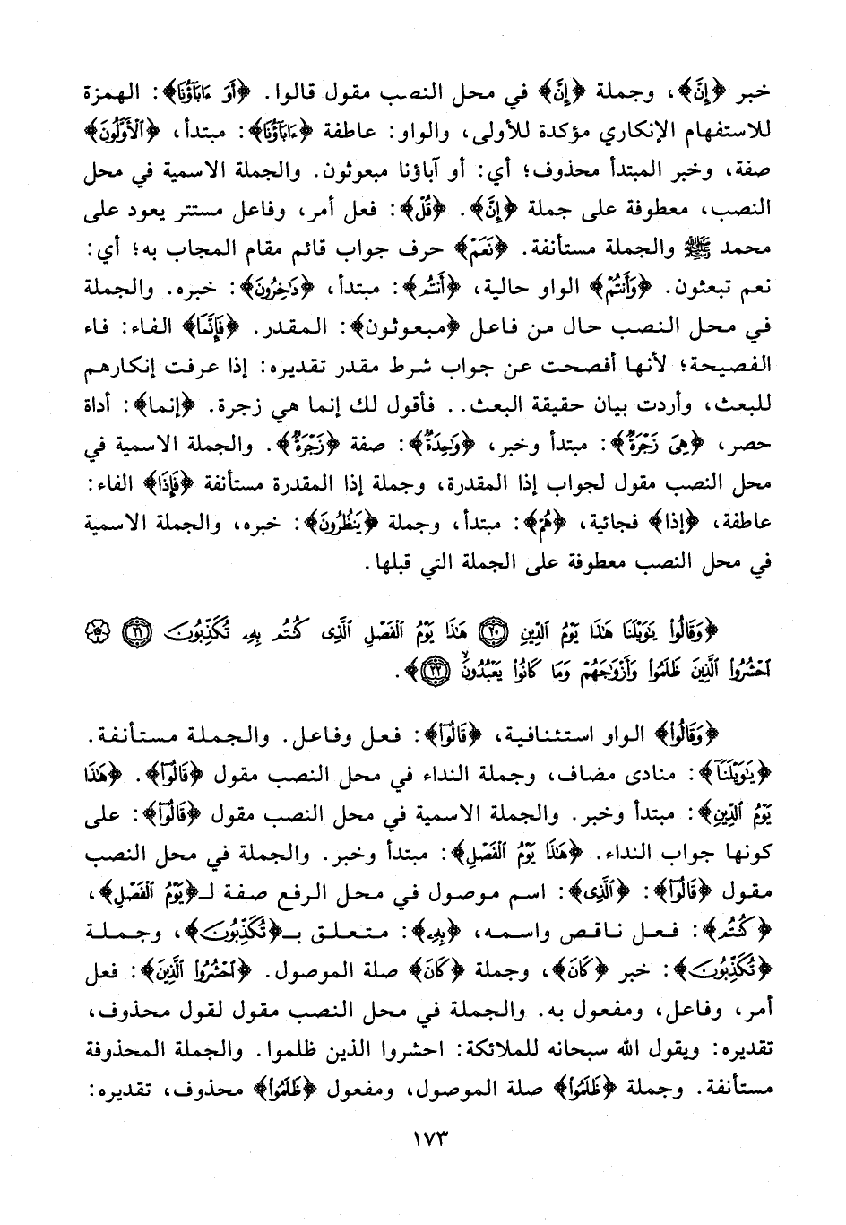 {وَقالُوا} الواو استئنافية، {قالُوا}: فعل وفاعل. والجملة مستأنفة. {يا وَيْلَنا}: منادى مضاف، وجملة النداء في محل النصب مقول {قالُوا}. {هذا يَوْمُ الدِّينِ}: مبتدأ وخبر. والجملة الاسمية في محل النصب مقول {قالُوا}: على كونها جواب النداء. {هذا يَوْمُ الْفَصْلِ}: مبتدأ وخبر. والجملة في محل النصب مقول {قالُوا}: {الَّذِي}: اسم موصول في محل الرفع صفة لـ {يَوْمُ الْفَصْلِ}، {كُنْتُمْ}: فعل ناقص واسمه، {بِهِ}: متعلق بـ {تُكَذِّبُونَ}، وجملة {تُكَذِّبُونَ}: خبر {كان}، وجملة {كان} صلة الموصول. {احْشُرُوا الَّذِينَ}: فعل أمر، وفاعل، ومفعول به. والجملة في محل النصب مقول لقول محذوف، تقديره: ويقول الله سبحانه للملائكة: احشروا الذين ظلموا. والجملة المحذوفة مستأنفة. وجملة {ظَلَمُوا} صلة الموصول، ومفعول {ظَلَمُوا} محذوف، تقديره: