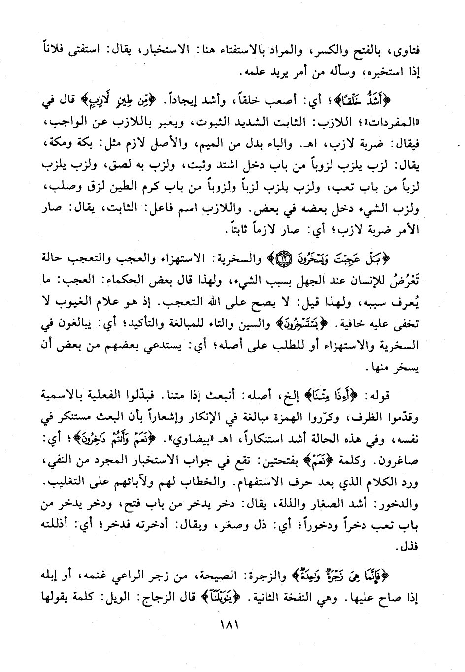 {بَلْ عَجِبْتَ وَيَسْخَرُونَ (12)} والسخرية: الاستهزاء والعجب والتعجب حالة تعرض للإنسان عند الجهل بسبب الشيء، ولهذا قال بعض الحكماء: العجب: ما يعرف سببه، ولهذا قيل: لا يصح على الله التعجب. إذ هو علام الغيوب لا تخفى عليه خافية. {يَسْتَسْخِرُونَ} والسين والتاء للمبالغة والتأكيد؛ أي: يبالغون في السخرية والاستهزاء أو للطلب على أصله؛ أي: يستدعي بعضهم من بعض أن يسخر منها.
