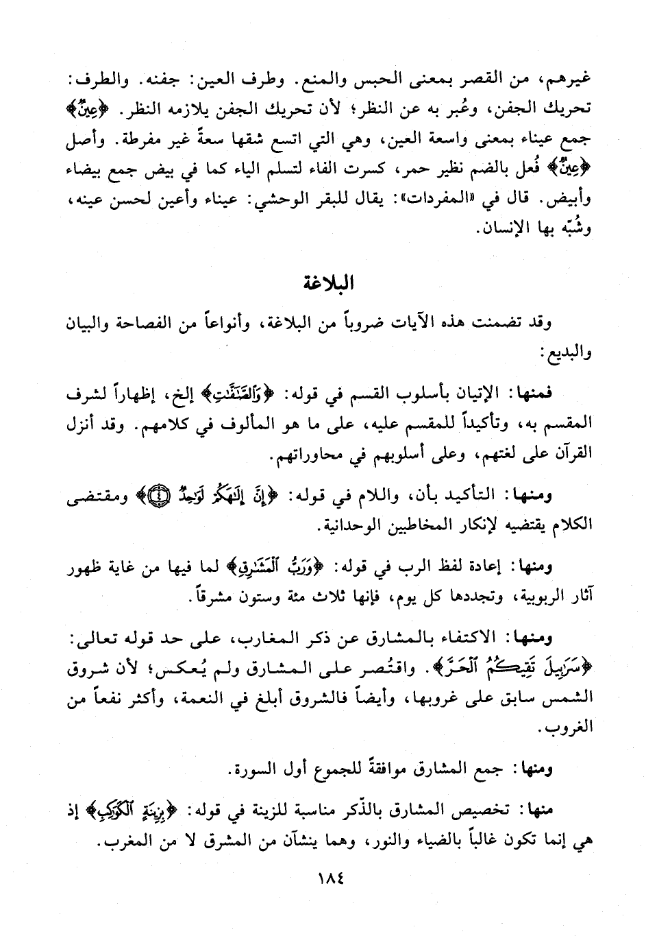 ومنها: الاكتفاء بالمشارق عن ذكر المغارب، على حد قوله تعالى: {سَرابِيلَ تَقِيكُمُ الْحَرَّ}. واقتصر على المشارق ولم يعكس؛ لأن شروق الشمس سابق على غروبها، وأيضا فالشروق أبلغ في النعمة، وأكثر نفعًا من الغروب.