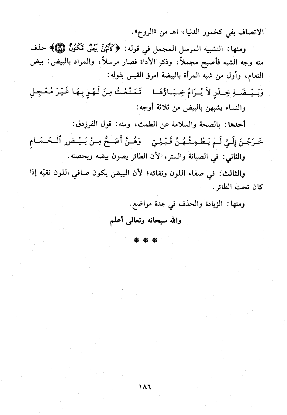 ومنها: التشبيه المرسل المجمل في قوله: {كَأَنَّهُنَّ بَيْضٌ مَكْنُونٌ (49)} حذف منه وجه الشبه فأصبح مجملًا، وذكر الأداة فصار مرسلًا، والمراد بالبيض: بيض النعام، وأول من شبه المرأة بالبيضة امرؤ القيس بقوله: