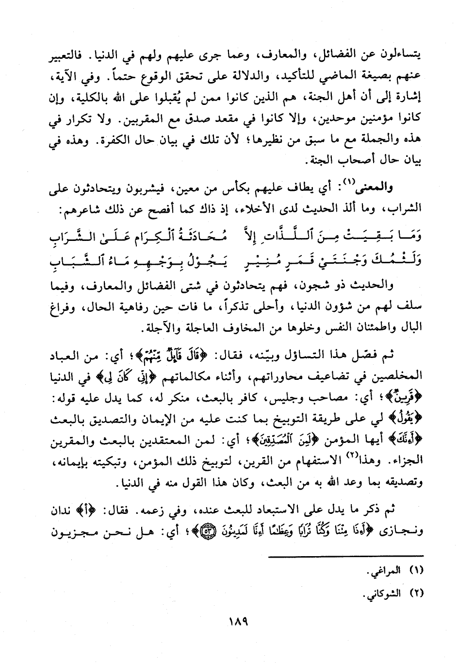 والمعنى (¬1): أي يطاف عليهم بكأس من معين، فيشربون ويتحادثون على الشراب، وما ألذ الحديث لدى الأخلاء، إذ ذاك كما أفصح عن ذلك شاعرهم: