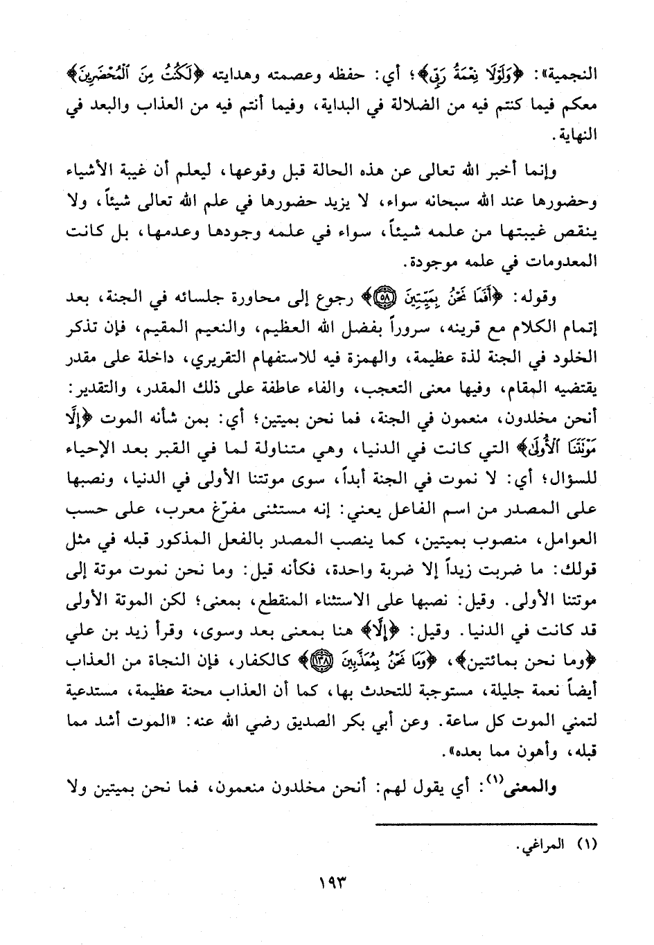 59 - {إِلَّا مَوْتَتَنَا الْأُولى} التي كانت في الدنيا، وهي متناولة لما في القبر بعد الإحياء للسؤال؛ أي: لا نموت في الجنة أبدًا، سوى موتتنا الأولى في الدنيا، ونصبها على المصدر من اسم الفاعل يعني: إنه مستثنى مفرّغ معرب، على حسب العوامل، منصوب بميتين، كما ينصب المصدر بالفعل المذكور قبله في مثل قولك: ما ضربت زيدًا إلا ضربة واحدة، فكأنه قيل: وما نحن نموت موتة إلى موتتنا الأولى. وقيل: نصبها على الاستثناء المنقطع، بمعنى؛ لكن الموتة الأولى قد كانت في الدنيا. وقيل: {إِلَّا} هنا بمعنى بعد وسوى، وقرأ زيد بن علي {وما نحن بمائتين}، {وَما نَحْنُ بِمُعَذَّبِينَ (138)} كالكفار، فإن النجاة من العذاب أيضًا نعمة جليلة، مستوجبة للتحدث بها، كما أن العذاب محنة عظيمة، مستدعية لتمني الموت كل ساعة. وعن أبي بكر الصديق رضي الله عنه: «الموت أشد مما قبله، وأهون مما بعده».