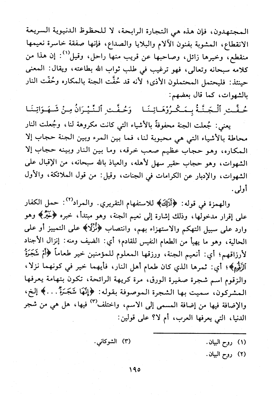 المجتهدون، فإن هذه هي التجارة الرابحة، لا للحظوظ الدنيوية السريعة الانقطاع، المشوبة بفنون الآلام والبلايا والصداع، فإنها صفقة خاسرة نعيمها منقطع، وخيرها زائل، وصاحبها عن قريب منها راحل، وقيل (¬1): إن هذا من كلامه سبحانه وتعالى، فهو ترغيب في طلب ثواب الله بطاعته، ويقال: المعنى حينئذ: فليحتمل المحتملون الأذى؛ لأنه قد حفّت الجنة بالمكاره وحفّت النار بالشهوات، كما قال بعضهم: