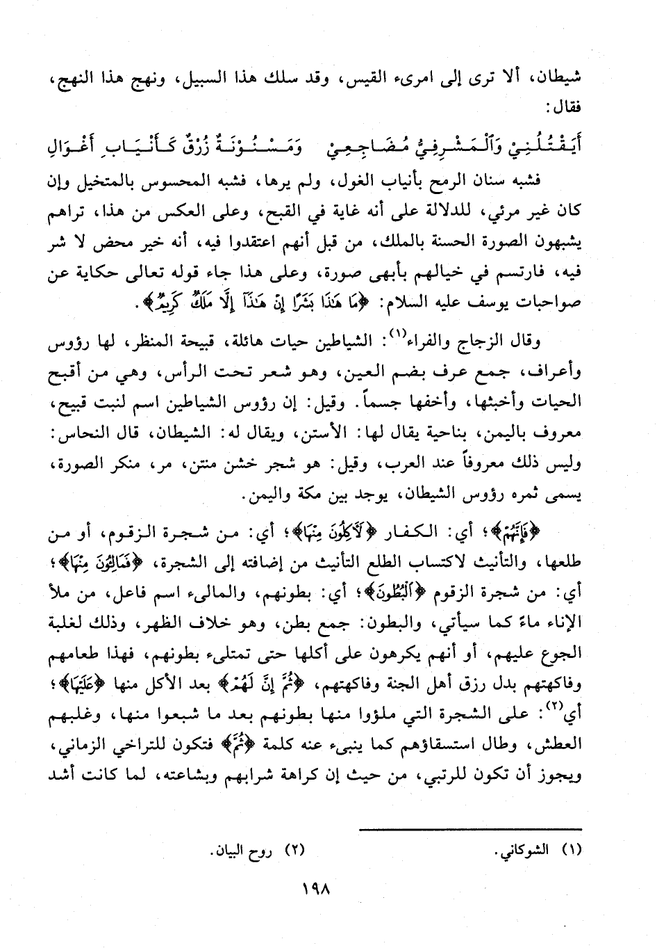 وقال الزجاج والفراء (¬1): الشياطين حيات هائلة، قبيحة المنظر، لها رؤوس وأعراف، جمع عرف بضم العين، وهو شعر تحت الرأس، وهي من أقبح الحيات وأخبثها، وأخفها جسمًا. وقيل: إن رؤوس الشياطين اسم لنبت قبيح، معروف باليمن، بناحية يقال لها: الأستن، ويقال له: الشيطان، قال النحاس: وليس ذلك معروفًا عند العرب، وقيل: هو شجر خشن منتن، مر، منكر الصورة، يسمى ثمره رؤوس الشيطان، يوجد بين مكة واليمن.