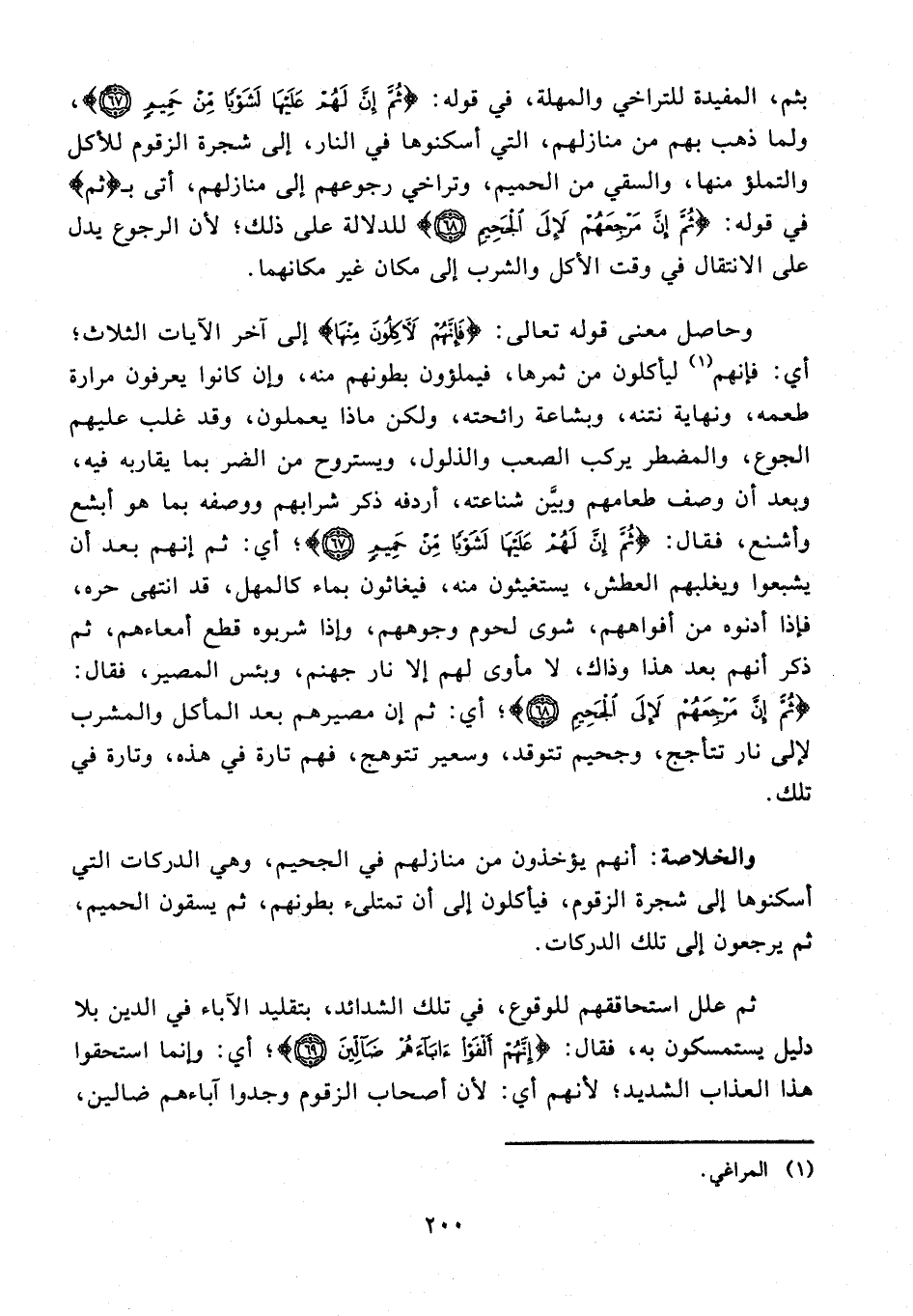 بثم، المفيدة للتراخي والمهلة، في قوله: {ثُمَّ إِنَّ لَهُمْ عَلَيْها لَشَوْبًا مِنْ حَمِيمٍ (67)}، ولما ذهب بهم من منازلهم، التي أسكنوها في النار، إلى شجرة الزقوم للأكل والتملؤ منها، والسقي من الحميم، وتراخي رجوعهم إلى منازلهم، أتى بـ {ثُمَّ} في قوله: {ثُمَّ إِنَّ مَرْجِعَهُمْ لَإِلَى الْجَحِيمِ (68)} للدلالة على ذلك؛ لأن الرجوع يدل على الانتقال في وقت الأكل والشرب إلى مكان غير مكانهما.