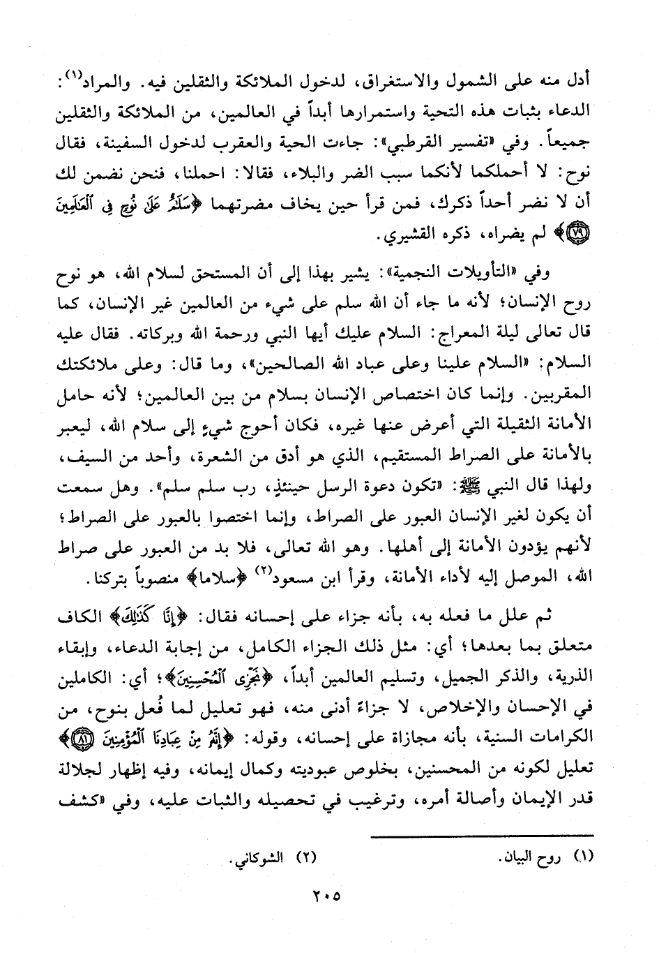 وفي «التأويلات النجمية»: يشير بهذا إلى أن المستحق لسلام الله، هو نوح روح الإنسان؛ لأنه ما جاء أن الله سلم على شيء من العالمين غير الإنسان، كما قال تعالى ليلة المعراج: السلام عليك أيها النبي ورحمة الله وبركاته. فقال عليه السلام: «السلام علينا وعلى عباد الله الصالحين»، وما قال: وعلى ملائكتك المقربين. وإنما كان اختصاص الإنسان بسلام من بين العالمين؛ لأنه حامل الأمانة الثقيلة التي أعرض عنها غيره، فكان أحوج شيءٍ إلى سلام الله، ليعبر بالأمانة على الصراط المستقيم، الذي هو أدق من الشعرة، وأحد من السيف، ولهذا قال النبي - صلى الله عليه وسلم -: «تكون دعوة الرسل حينئذٍ، رب سلم سلم». وهل سمعت أن يكون لغير الإنسان العبور على الصراط، وإنما اختصوا بالعبور على الصراط؛ لأنهم يؤدون الأمانة إلى أهلها. وهو الله تعالى، فلا بد من العبور على صراط الله، الموصل إليه لأداء الأمانة، وقرأ ابن مسعود (¬2) {سَلامًا} منصوبًا بتركنا.