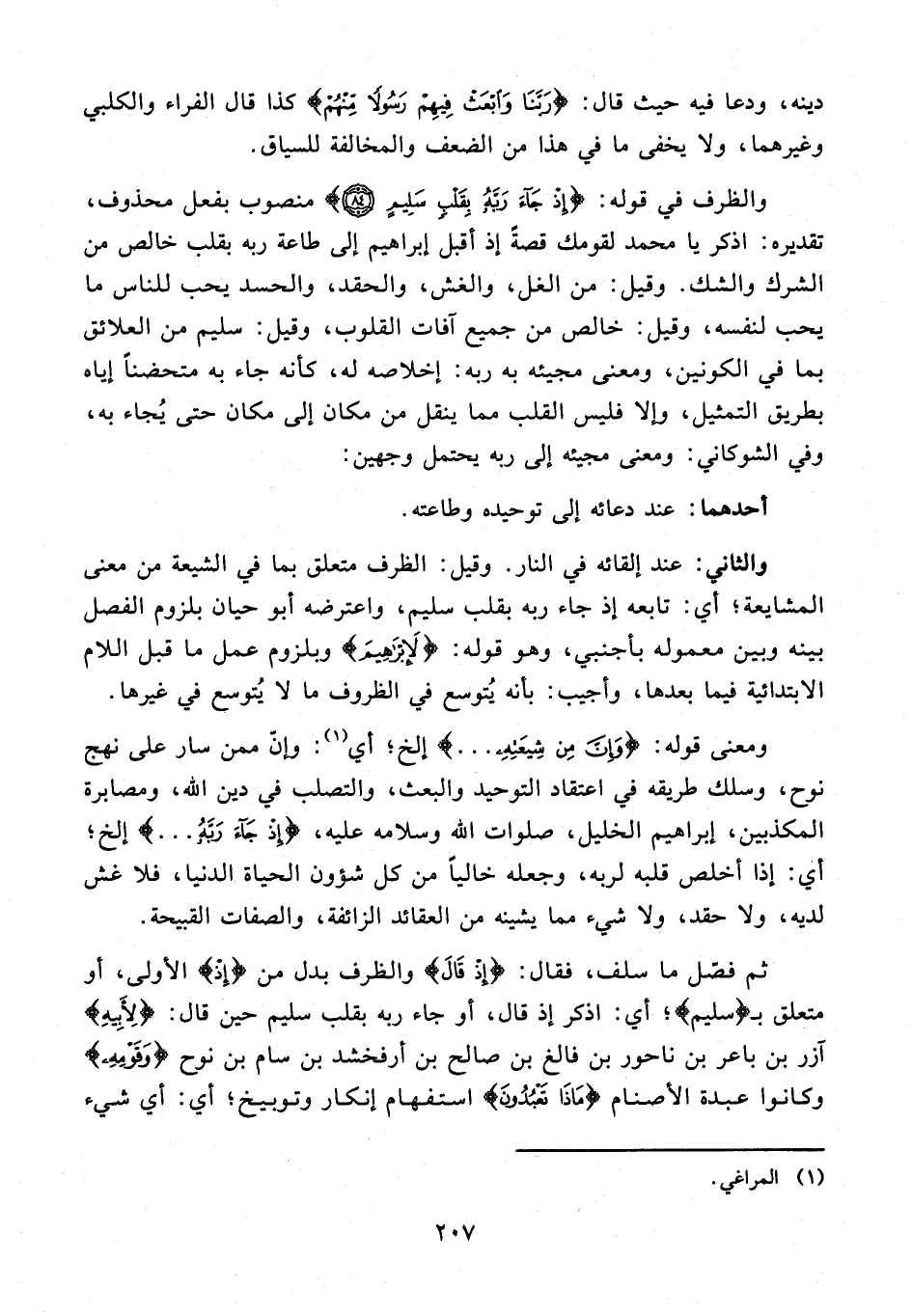 84 - والظرف في قوله: {إِذْ جاءَ رَبَّهُ بِقَلْبٍ سَلِيمٍ (84)} منصوب بفعل محذوف، تقديره: اذكر يا محمد لقومك قصةً إذ أقبل إبراهيم إلى طاعة ربه بقلب خالص من الشرك والشك. وقيل: من الغل، والغش، والحقد، والحسد يحب للناس ما يحب لنفسه، وقيل: خالص من جميع آفات القلوب، وقيل: سليم من العلائق بما في الكونين، ومعنى مجيئه به ربه: إخلاصه له، كأنه جاء به متحضنًا إياه بطريق التمثيل، وإلا فليس القلب مما ينقل من مكان إلى مكان حتى يجاء به، وفي الشوكاني: ومعنى مجيئه إلى ربه يحتمل وجهين: