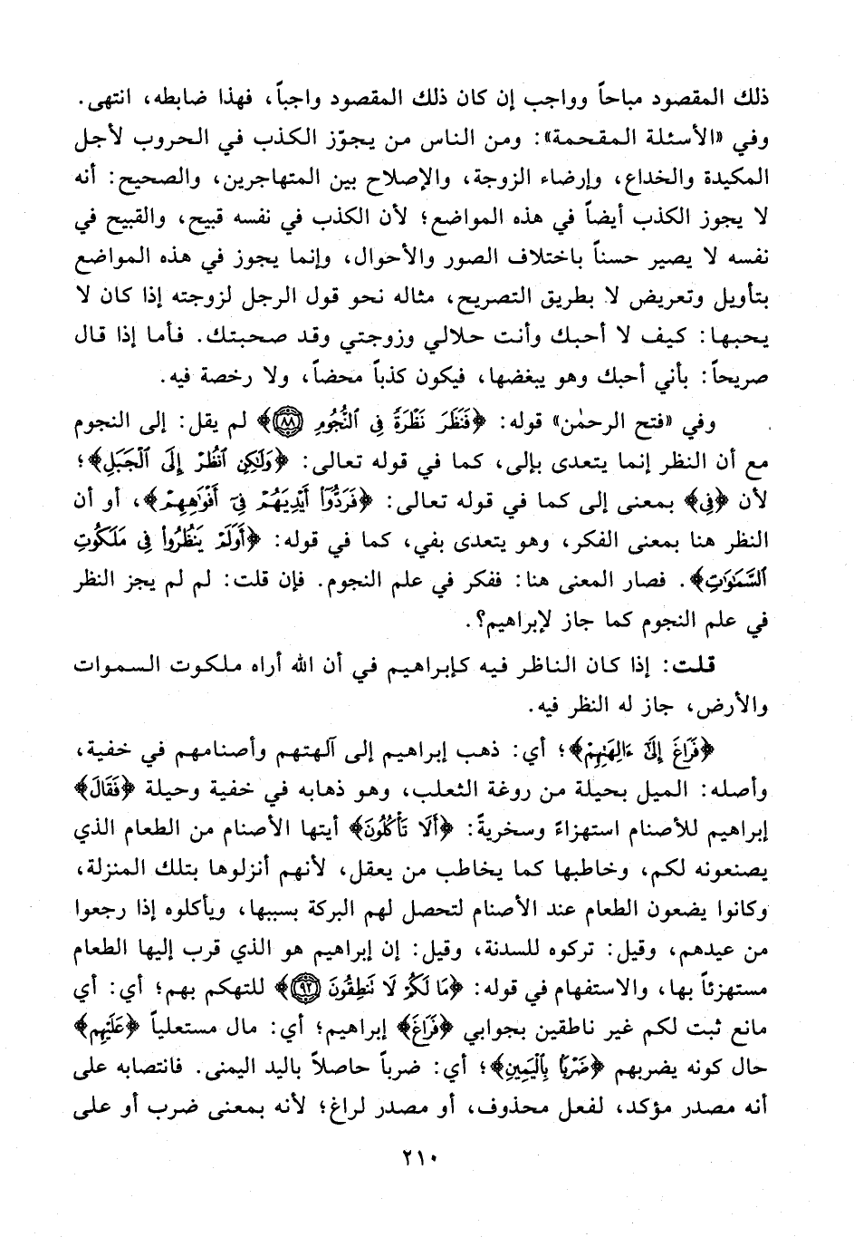 وفي «فتح الرحمن» قوله: {فَنَظَرَ نَظْرَةً فِي النُّجُومِ (88)} لم يقل: إلى النجوم مع أن النظر إنما يتعدى بإلى، كما في قوله تعالى: {وَلكِنِ انْظُرْ إِلَى الْجَبَلِ}؛ لأن {فِي} بمعنى إلى كما في قوله تعالى: {فَرَدُّوا أَيْدِيَهُمْ فِي أَفْواهِهِمْ}، أو أن النظر هنا بمعنى الفكر، وهو يتعدى بفي، كما في قوله: {أَوَلَمْ يَنْظُرُوا فِي مَلَكُوتِ السَّماواتِ}. فصار المعنى هنا: ففكر في علم النجوم. فإن قلت: لم لم يجز النظر في علم النجوم كما جاز لإبراهيم؟.
