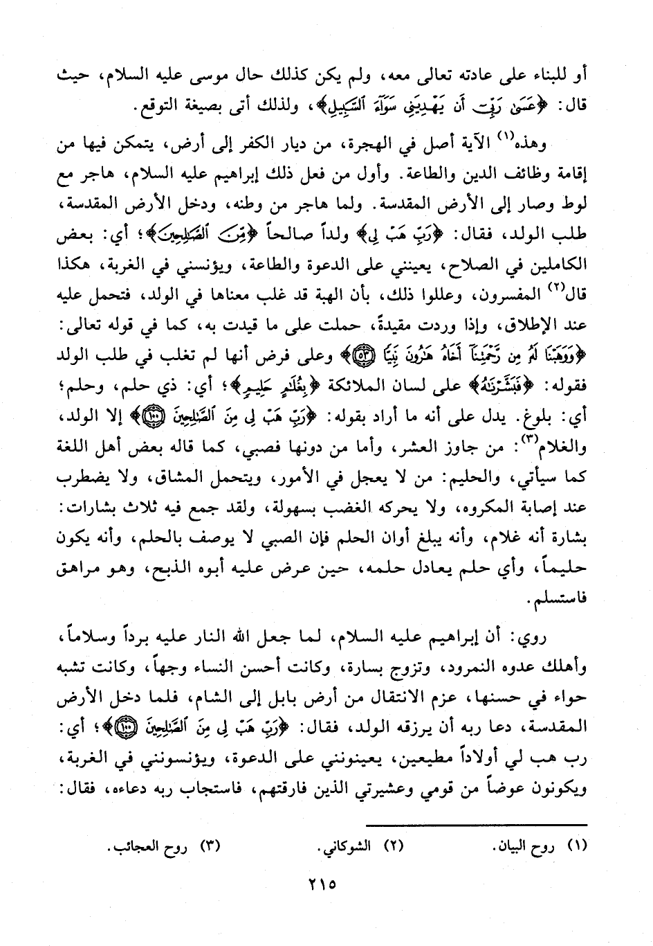 وجهًا، وكانت تشبه حواء في حسنها، عزم الانتقال من أرض بابل إلى الشام، فلما دخل الأرض المقدسة، دعا ربه أن يرزقه الولد، فقال: {رَبِّ هَبْ لِي مِنَ الصَّالِحِينَ (100)}؛ أي: رب هب لي أولادًا مطيعين، يعينونني على الدعوة، ويؤنسونني في الغربة، ويكونون عوضًا من قومي وعشيرتي الذين فارقتهم،