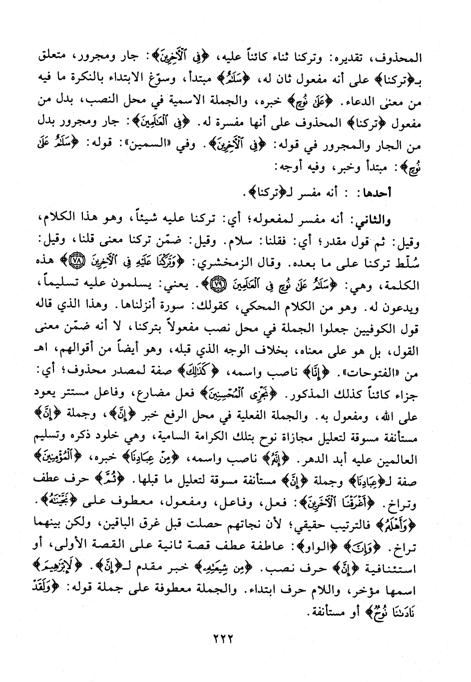 والثاني: أنه مفسر لمفعوله؛ أي: تركنا عليه شيئًا، وهو هذا الكلام، وقيل: ثم قول مقدر؛ أي: فقلنا: سلام. وقيل: ضمّن تركنا معنى قلنا، وقيل: سلّط تركنا على ما بعده. وقال الزمخشري: {وَتَرَكْنا عَلَيْهِ فِي الْآخِرِينَ (78)} هذه الكلمة، وهي: {سَلامٌ عَلى نُوحٍ فِي الْعالَمِينَ (79)}. يعني: يسلمون عليه تسليمًا، ويدعون له. وهو من الكلام المحكي، كقولك: سورة أنزلناها. وهذا الذي قاله قول الكوفيين جعلوا الجملة في محل نصب مفعولًا بتركنا، لا أنه ضمّن معنى القول، بل هو على معناه، بخلاف الوجه الذي قبله، وهو أيضًا من أقوالهم، اهـ من «الفتوحات». {إِنَّا} ناصب واسمه، {كَذلِكَ} صفة لمصدر محذوف؛ أي: جزاء كائنًا كذلك المذكور. {نَجْزِي الْمُحْسِنِينَ} فعل مضارع، وفاعل مستتر يعود على الله، ومفعول به. والجملة الفعلية في محل الرفع خبر {إن}، وجملة {إن} مستأنفة مسوقة لتعليل مجازاة نوح بتلك الكرامة السامية، وهي خلود ذكره وتسليم العالمين عليه أبد الدهر. {إِنَّهُ} ناصب واسمه، {مِنْ عِبادِنَا} خبره، {الْمُؤْمِنِينَ} صفة لـ {عِبادِنَا} وجملة {إن} مستأنفة مسوقة لتعليل ما قبلها. {ثُمَّ} حرف عطف وتراخ. {أَغْرَقْنَا الْآخَرِينَ}: فعل، وفاعل، ومفعول، معطوف على {نَجَّيْناهُ}. {وَأَهْلَهُ} فالترتيب حقيقي؛ لأن نجاتهم حصلت قبل غرق الباقين، ولكن بينهما تراخ. {وَإِنَّ} {الواو}: عاطفة عطف قصة ثانية على القصة الأولى، أو استئنافية {إِنَّ} حرف نصب. {مِنْ شِيعَتِهِ} خبر مقدم لـ {إِنَّ}. {لَإِبْراهِيمَ} اسمها مؤخر، واللام حرف ابتداء. والجملة معطوفة على جملة قوله: {وَلَقَدْ نادانا نُوحٌ} أو مستأنفة.