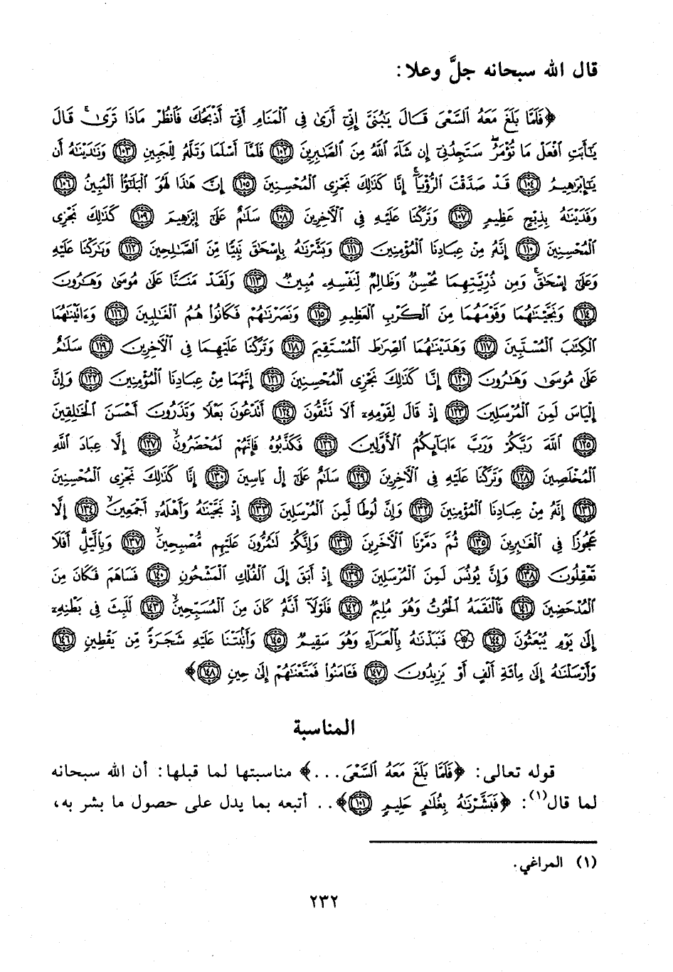 {فَلَمَّا بَلَغَ مَعَهُ السَّعْيَ قالَ يا بُنَيَّ إِنِّي أَرى فِي الْمَنامِ أَنِّي أَذْبَحُكَ فَانْظُرْ ماذا تَرى قالَ يا أَبَتِ افْعَلْ ما تُؤْمَرُ سَتَجِدُنِي إِنْ شاءَ اللَّهُ مِنَ الصَّابِرِينَ (102) فَلَمَّا أَسْلَما وَتَلَّهُ لِلْجَبِينِ (103) وَنادَيْناهُ أَنْ يا إِبْراهِيمُ (104) قَدْ صَدَّقْتَ الرُّؤْيا إِنَّا كَذلِكَ نَجْزِي الْمُحْسِنِينَ (105) إِنَّ هذا لَهُوَ الْبَلاءُ الْمُبِينُ (106) وَفَدَيْناهُ بِذِبْحٍ عَظِيمٍ (107) وَتَرَكْنا عَلَيْهِ فِي الْآخِرِينَ (108) سَلامٌ عَلى إِبْراهِيمَ (109) كَذلِكَ نَجْزِي الْمُحْسِنِينَ (110) إِنَّهُ مِنْ عِبادِنَا الْمُؤْمِنِينَ (111) وَبَشَّرْناهُ بِإِسْحاقَ نَبِيًّا مِنَ الصَّالِحِينَ (112) وَبارَكْنا عَلَيْهِ وَعَلى إِسْحاقَ وَمِنْ ذُرِّيَّتِهِما مُحْسِنٌ وَظالِمٌ لِنَفْسِهِ مُبِينٌ (113) وَلَقَدْ مَنَنَّا عَلى مُوسى وَهارُونَ (114) وَنَجَّيْناهُما وَقَوْمَهُما مِنَ الْكَرْبِ الْعَظِيمِ (115) وَنَصَرْناهُمْ فَكانُوا هُمُ الْغالِبِينَ (116) وَآتَيْناهُمَا الْكِتابَ الْمُسْتَبِينَ (117) وَهَدَيْناهُمَا الصِّراطَ الْمُسْتَقِيمَ (118) وَتَرَكْنا عَلَيْهِما فِي الْآخِرِينَ (119) سَلامٌ عَلى مُوسى وَهارُونَ (120) إِنَّا كَذلِكَ نَجْزِي الْمُحْسِنِينَ (121) إِنَّهُما مِنْ عِبادِنَا الْمُؤْمِنِينَ (122) وَإِنَّ إِلْياسَ لَمِنَ الْمُرْسَلِينَ (123) إِذْ قالَ لِقَوْمِهِ أَلا تَتَّقُونَ (124) أَتَدْعُونَ بَعْلًا وَتَذَرُونَ أَحْسَنَ الْخالِقِينَ (125) اللَّهَ رَبَّكُمْ وَرَبَّ آبائِكُمُ الْأَوَّلِينَ (126) فَكَذَّبُوهُ فَإِنَّهُمْ لَمُحْضَرُونَ (127) إِلاَّ عِبادَ اللَّهِ الْمُخْلَصِينَ (128) وَتَرَكْنا عَلَيْهِ فِي الْآخِرِينَ (129) سَلامٌ عَلى إِلْ ياسِينَ (130) إِنَّا كَذلِكَ نَجْزِي الْمُحْسِنِينَ (131) إِنَّهُ مِنْ عِبادِنَا الْمُؤْمِنِينَ (132) وَإِنَّ لُوطًا لَمِنَ الْمُرْسَلِينَ (133) إِذْ نَجَّيْناهُ وَأَهْلَهُ أَجْمَعِينَ (134) إِلاَّ عَجُوزًا فِي الْغابِرِينَ (135) ثُمَّ دَمَّرْنَا الْآخَرِينَ (136) وَإِنَّكُمْ لَتَمُرُّونَ عَلَيْهِمْ مُصْبِحِينَ (137) وَبِاللَّيْلِ أَفَلا تَعْقِلُونَ (138) وَإِنَّ يُونُسَ لَمِنَ الْمُرْسَلِينَ (139) إِذْ أَبَقَ إِلَى الْفُلْكِ الْمَشْحُونِ (140) فَساهَمَ فَكانَ مِنَ الْمُدْحَضِينَ (141) فَالْتَقَمَهُ الْحُوتُ وَهُوَ مُلِيمٌ (142) فَلَوْلا أَنَّهُ كانَ مِنَ الْمُسَبِّحِينَ (143) لَلَبِثَ فِي بَطْنِهِ إِلى يَوْمِ يُبْعَثُونَ (144) فَنَبَذْناهُ بِالْعَراءِ وَهُوَ سَقِيمٌ (145) وَأَنْبَتْنا عَلَيْهِ شَجَرَةً مِنْ يَقْطِينٍ (146) وَأَرْسَلْناهُ إِلى مِائَةِ أَلْفٍ أَوْ يَزِيدُونَ (147) فَآمَنُوا فَمَتَّعْناهُمْ إِلى حِينٍ (148)}.