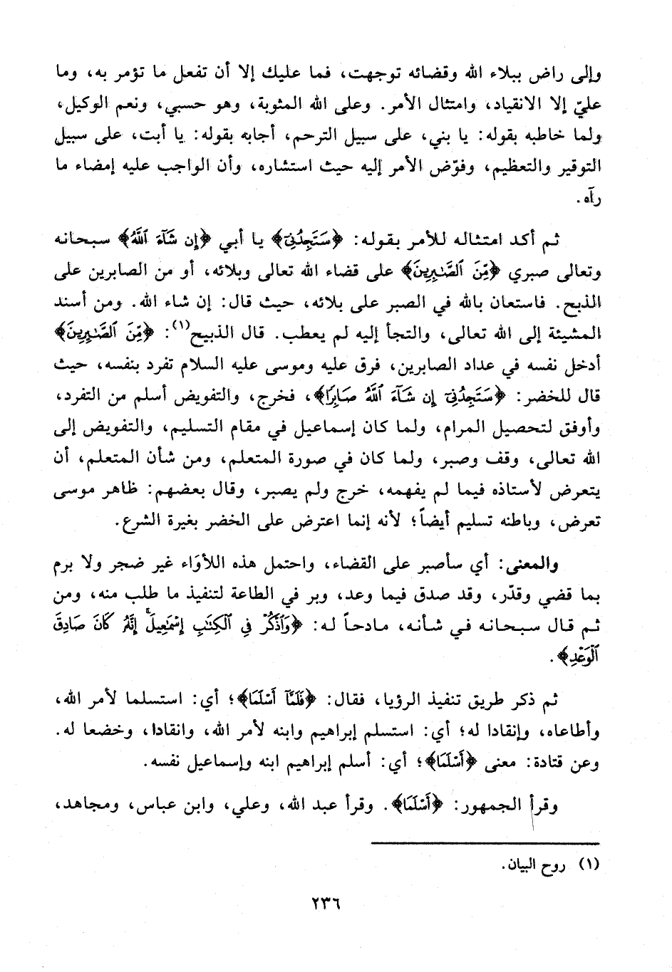 وإلى راض ببلاء الله وقضائه توجهت، فما عليك إلا أن تفعل ما تؤمر به، وما عليّ إلا الانقياد، وامتثال الأمر. وعلى الله المثوبة، وهو حسبي، ونعم الوكيل، ولما خاطبه بقوله: يا بني، على سبيل الترحم، أجابه بقوله: يا أبت، على سبيل التوقير والتعظيم، وفوّض الأمر إليه حيث استشاره، وأن الواجب عليه إمضاء ما رآه.