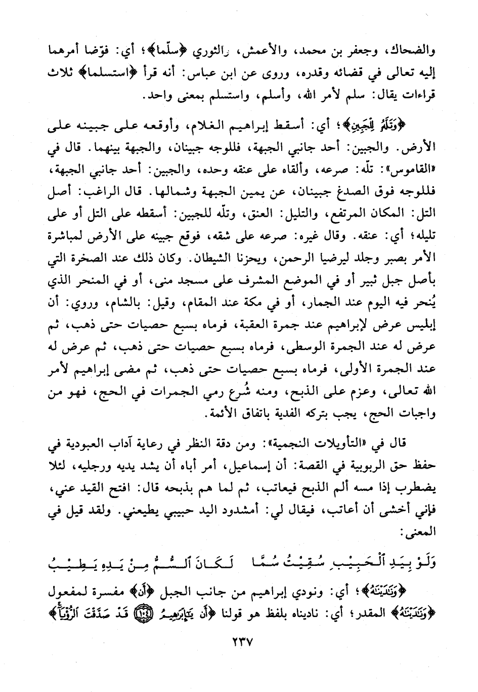 {وَتَلَّهُ لِلْجَبِينِ}؛ أي: أسقط إبراهيم الغلام، وأوقعه على جبينه على الأرض. والجبين: أحد جانبي الجبهة، فللوجه جبينان، والجبهة بينهما. قال في «القاموس»: تلّه: صرعه، وألقاه على عنقه وحده، والجبين: أحد جانبي الجبهة، فللوجه فوق الصدغ جبينان، عن يمين الجبهة وشمالها. قال الراغب: أصل التل: المكان المرتفع، والتليل: العنق، وتلّه للجبين: أسقطه على التل أو على تليله؛ أي: عنقه. وقال غيره: صرعه على شقه، فوقع جبينه على الأرض لمباشرة الأمر بصبر وجلد ليرضيا الرحمن، ويحزنا الشيطان. وكان ذلك عند الصخرة التي بأصل جبل ثبير أو في الموضع المشرف على مسجد منى، أو في المنحر الذي ينحر فيه اليوم عند الجمار، أو في مكة عند المقام، وقيل: بالشام، وروي: أن إبليس عرض لإبراهيم عند جمرة العقبة، فرماه بسبع حصيات حتى ذهب، ثم عرض له عند الجمرة الوسطى، فرماه بسبع حصيات حتى ذهب، ثم عرض له عند الجمرة الأولى، فرماه بسبع حصيات حتى ذهب، ثم مضى إبراهيم لأمر الله تعالى، وعزم على الذبح، ومنه شرع رمي الجمرات في الحج، فهو من واجبات الحج، يجب بتركه الفدية باتفاق الأئمة.