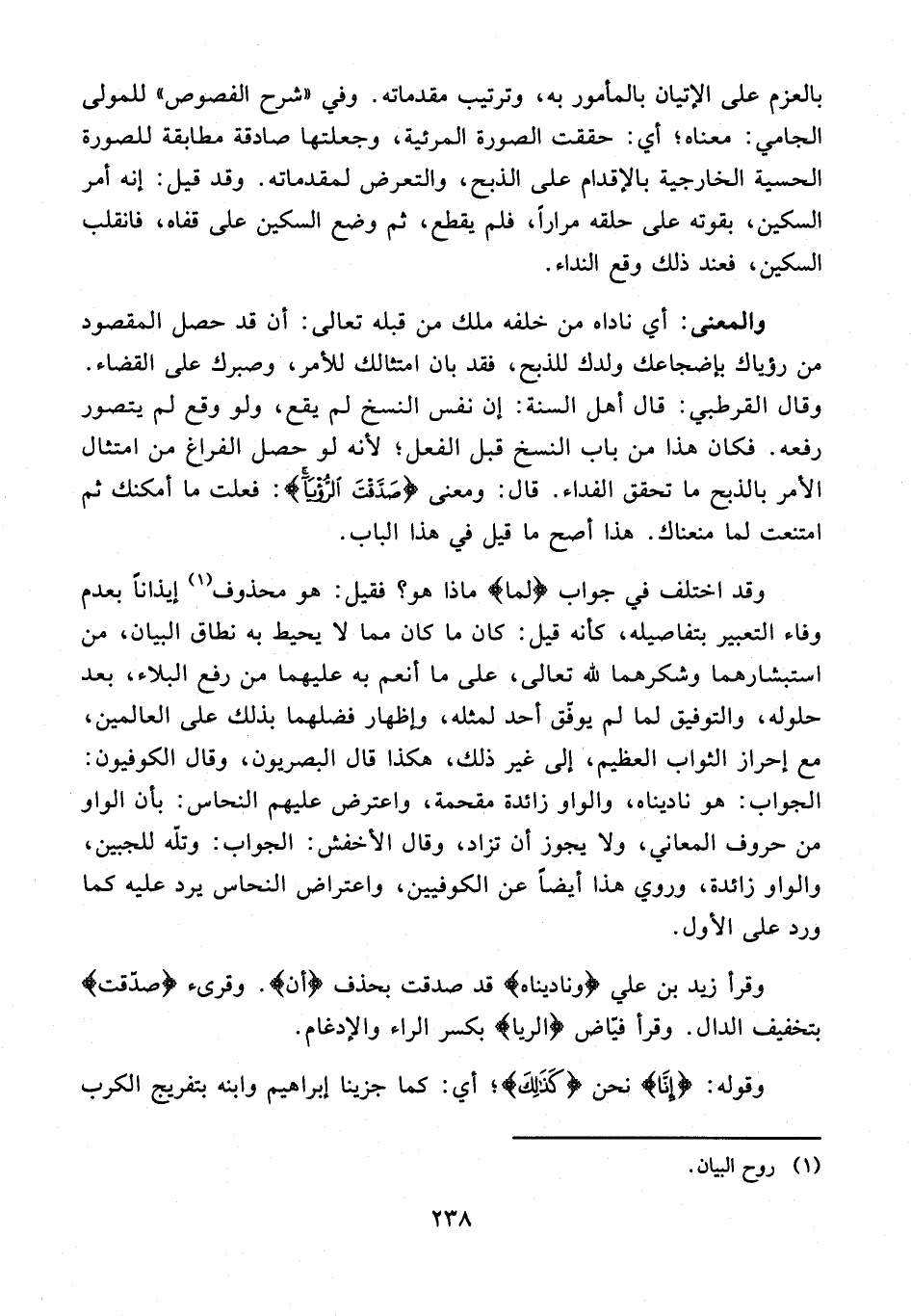 والمعنى: أي ناداه من خلفه ملك من قبله تعالى: أن قد حصل المقصود من رؤياك بإضجاعك ولدك للذبح، فقد بان امتثالك للأمر، وصبرك على القضاء. وقال القرطبي: قال أهل السنة: إن نفس النسخ لم يقع، ولو وقع لم يتصور رفعه. فكان هذا من باب النسخ قبل الفعل؛ لأنه لو حصل الفراغ من امتثال الأمر بالذبح ما تحقق الفداء.